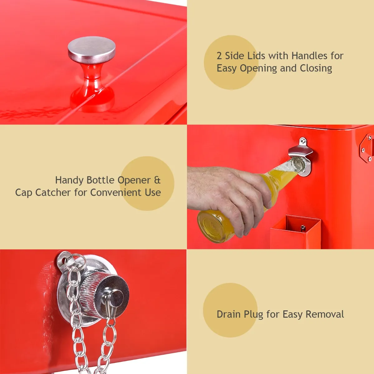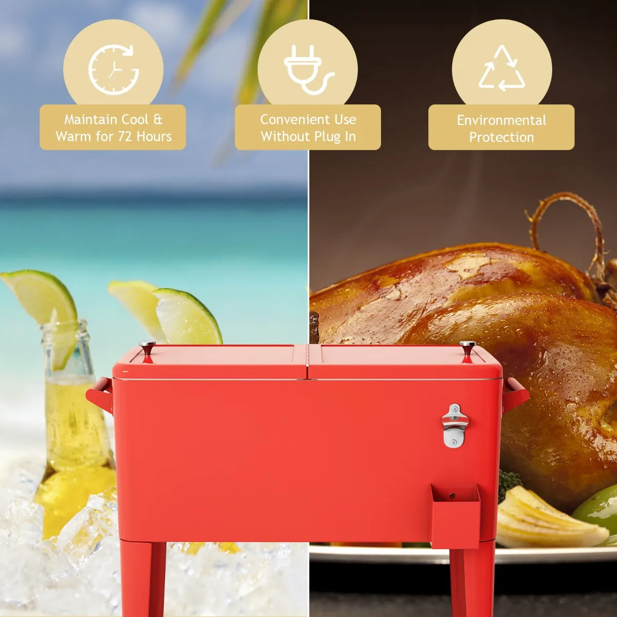 Het heeft een thermische isolatie effect van maximaal 72 uur, die niet alleen kan houden eten en drinken koel, maar ook warm te houden. 76L grote capaciteit is genoeg voor een grote familie. Hij heeft geen stroomaansluiting nodig en is uitgerust met 4 wielen, zodat hij gemakkelijk overal mee naartoe genomen kan worden. Twee deksels met handgrepen zijn gemakkelijk te openen en kunnen worden losgemaakt. Deze bolderwagen koelbox wordt geleverd met flesopener, zodat u moeiteloos flessen kunt openen.