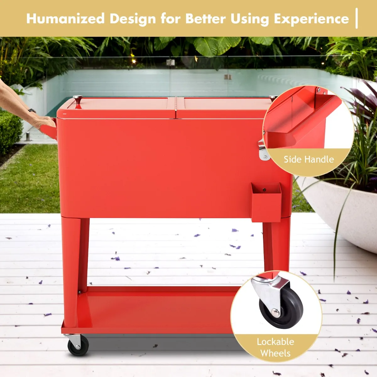【Gemakkelijke verplaatsing en snelle toegang】4 universele wielen maken het gemakkelijk en soepel om overal te verplaatsen. Twee van hen zijn vergrendelbaar om de koeler op zijn plaats te houden. Twee deksels zijn afneembaar en beide kunnen afzonderlijk worden geopend voor snelle toegang tot drankjes.