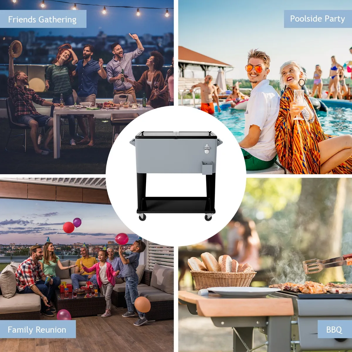 Het heeft een thermische isolatie effect van maximaal 72 uur, die niet alleen kan houden eten en drinken koel, maar ook warm te houden. 76L grote capaciteit is genoeg voor een grote familie. Hij heeft geen stroomaansluiting nodig en is uitgerust met 4 wielen, zodat hij gemakkelijk overal mee naartoe genomen kan worden. Twee deksels met handgrepen zijn gemakkelijk te openen en kunnen worden losgemaakt. Deze bolderwagen koelbox wordt geleverd met flesopener, zodat u moeiteloos flessen kunt openen.