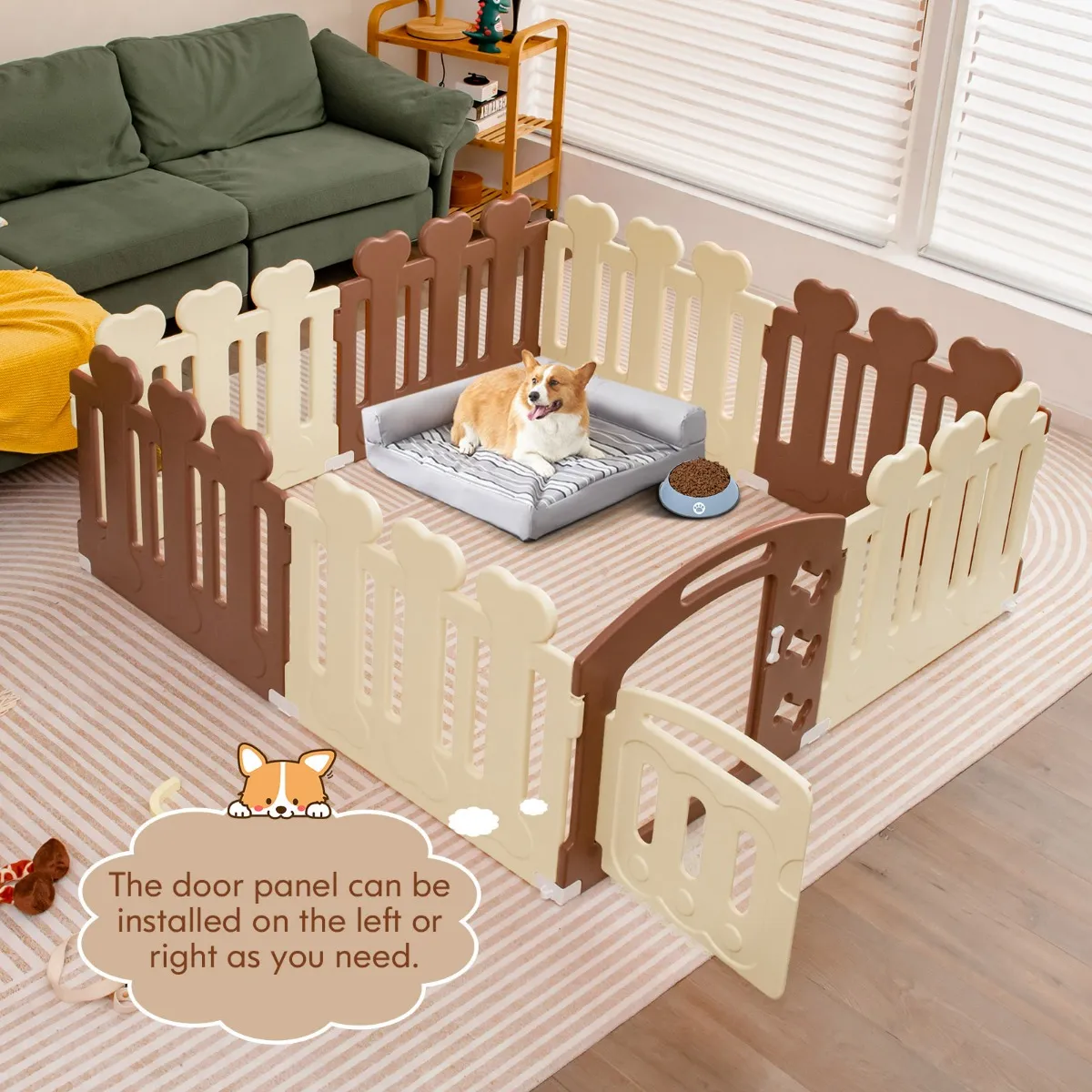 8 panelen box met deur: Deze huisdierbox bestaat uit 8 panelen, waarvan één met een deur is uitgerust. Als hij volledig is opgebouwd, biedt hij je huisdier veel ruimte om te spelen.