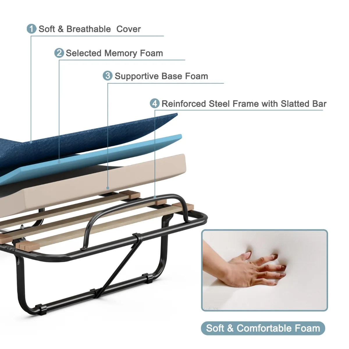 【Opvouwbaar en draagbaar design】 Dit klapbed kan eenvoudig in een compact formaat worden opgevouwen en onder het bed of in een hoek worden opgeborgen als het niet nodig is, wat vooral handig is als je weinig ruimte hebt. Je kunt hem zelfs door zijn geringe gewicht in de auto laden voor campinguitstapjes of reizen.