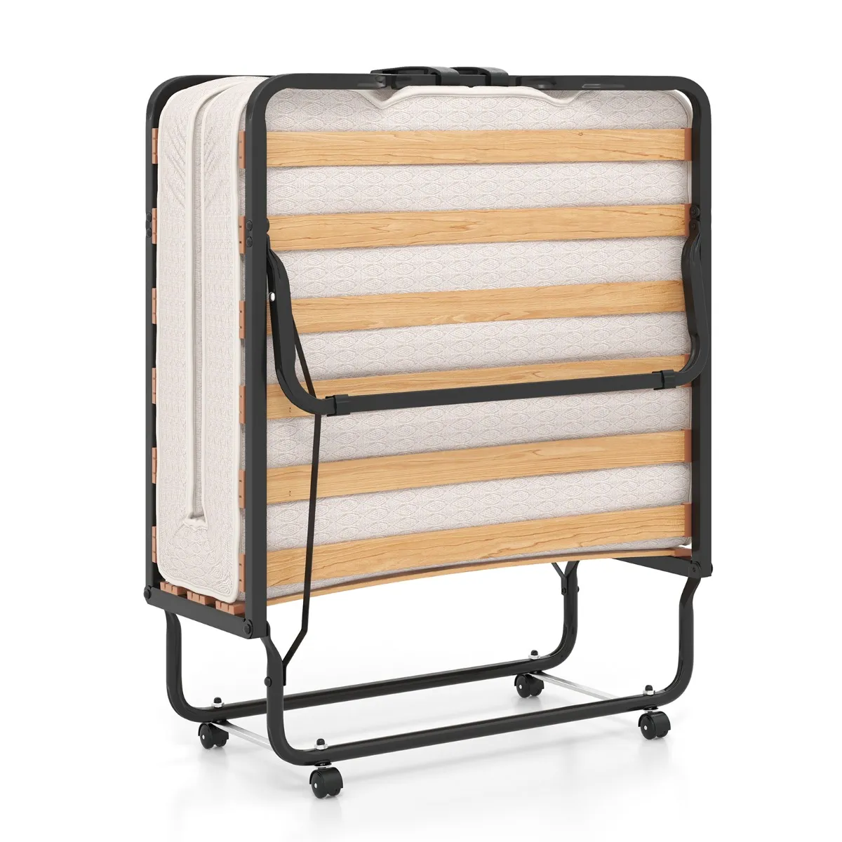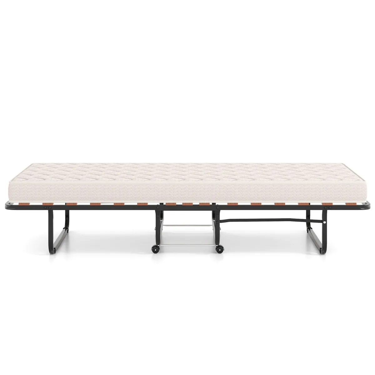 【Gebruiksvriendelijke constructie】: Dit opvouwbare metalen bed is ontworpen voor gebruiksgemak en is voorzien van 360° zwenkwielen, zodat u het gemakkelijk van de ene naar de andere kamer kunt verplaatsen. Het bed is bovendien voorzien van metalen steunen die de matras op zijn plaats houden, zelfs als u beweegt tijdens uw slaap.