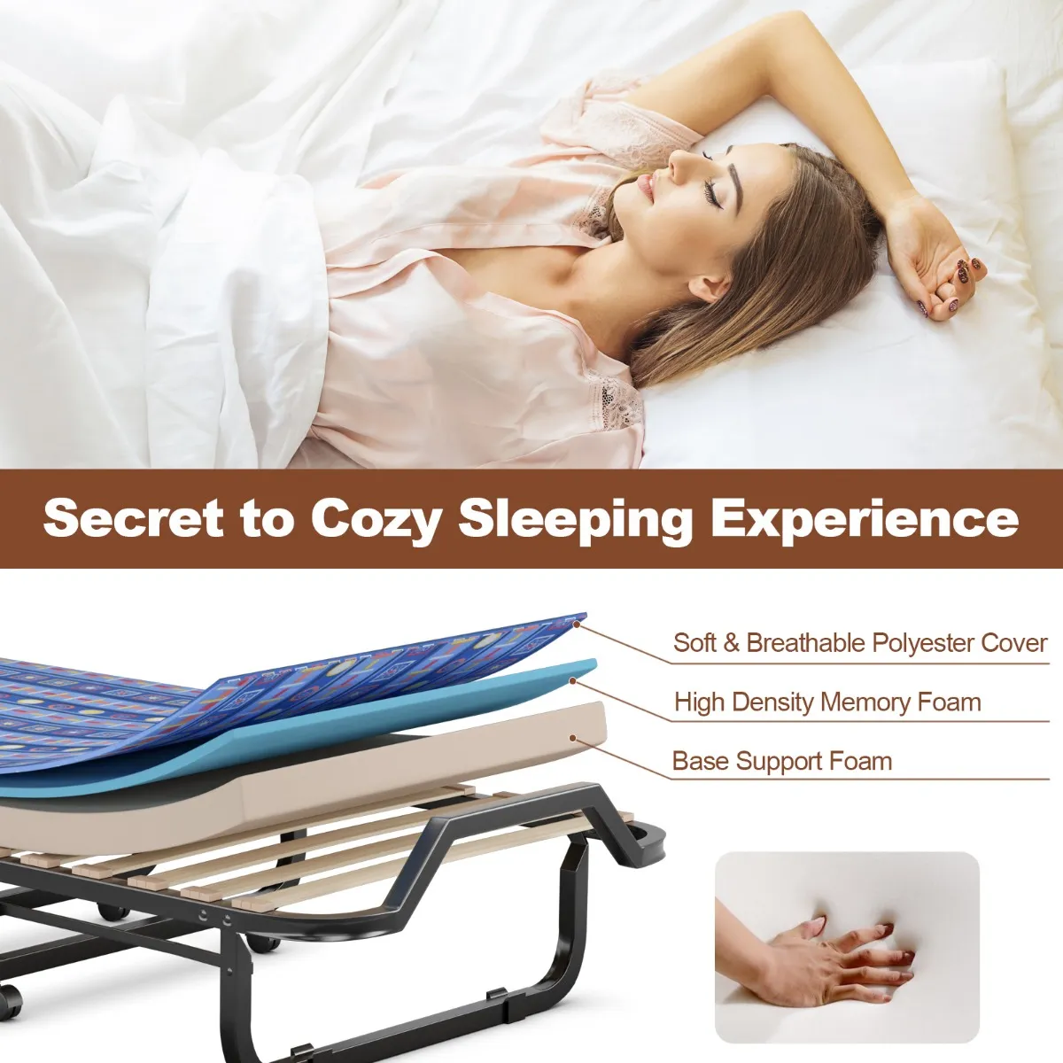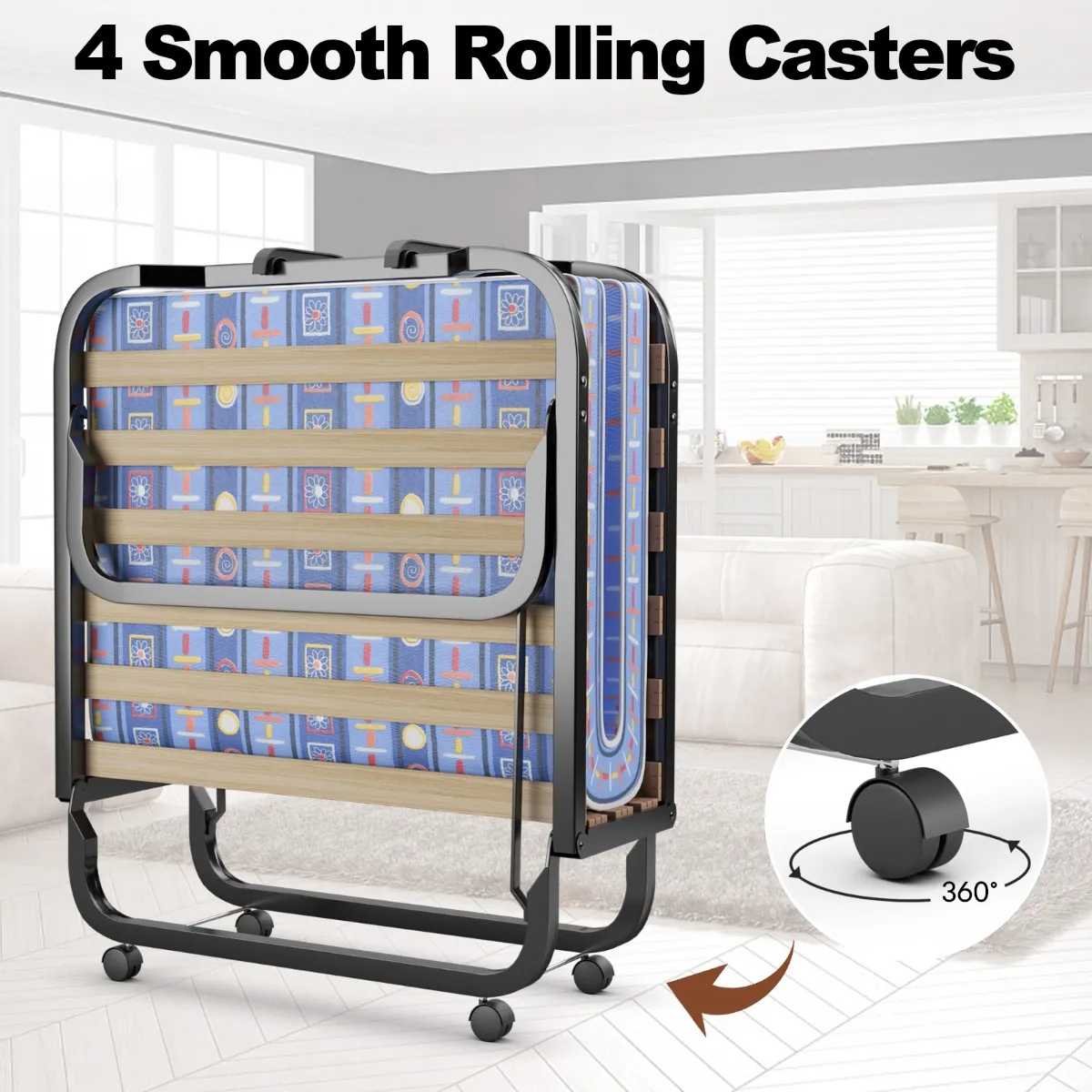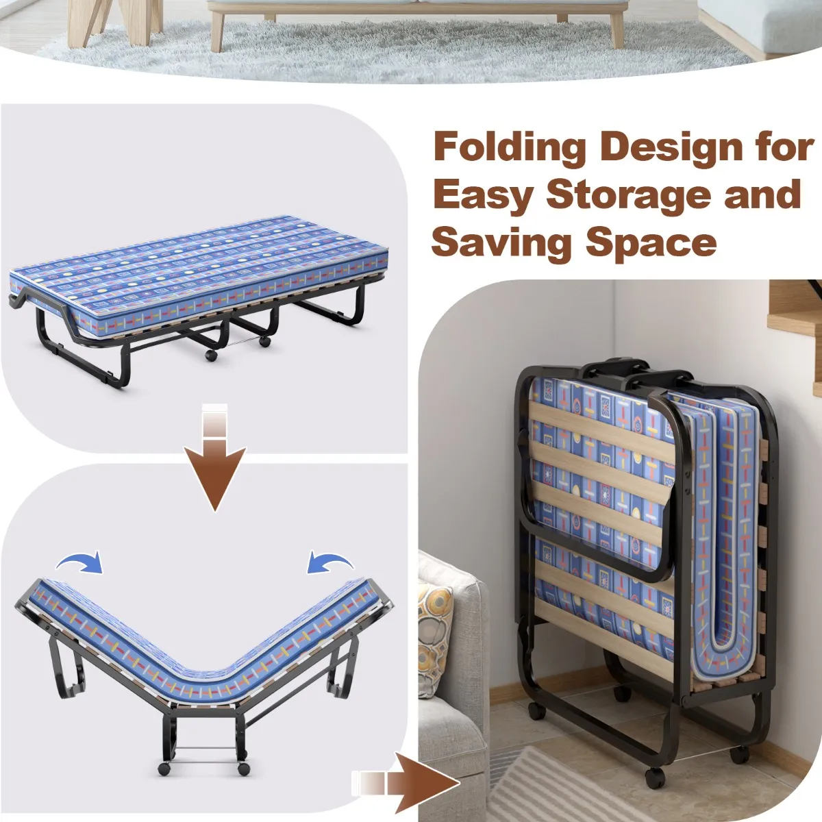 Heb je nog steeds problemen om geen extra reservebed voor gasten te hebben of niet te kunnen rusten op kantoor? Ons opklapbed met matras is de ideale keuze. Het van hoogwaardig staal gemaakte bedframe is robuust en duurzaam met een lange levensduur. Robuuste houten latten en zeer belastbare poten zorgen voor een uitstekend draagvermogen. De matras bestaat uit steunschuim met hoge dichtheid en traagschuim, dat zacht en elastisch is. Dit bed is bovendien uitgerust met 4 soepel lopende wielen, die je overal mee naartoe kunt bewegen. Bovendien kan dit bed bij niet-gebruik voor opslag snel tot een compact formaat worden opgevouwen.