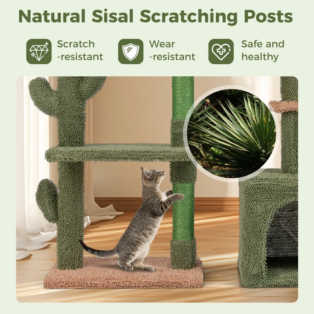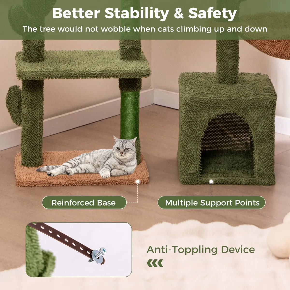 Onze moderne kattenboom met 4 niveaus is voorzien van een zachte, pluchen stoffen bekleding in boeiende groene en bruine tinten, aangevuld met schattige cactusvormen, waardoor een natuurlijke en uitnodigende uitstraling voor uw woonruimte ontstaat. Het beschikt over een comfortabele zitstok, hangmat, privéappartement en ruim platform. De krabpalen zijn gemaakt van natuurlijk sisal, wat een bevredigende textuur biedt voor krabben en strekken. De grote, stevige basis en het kantelbeveiligingssysteem zorgen voor een veilige en stabiele omgeving waarin uw kat vrij kan spelen.