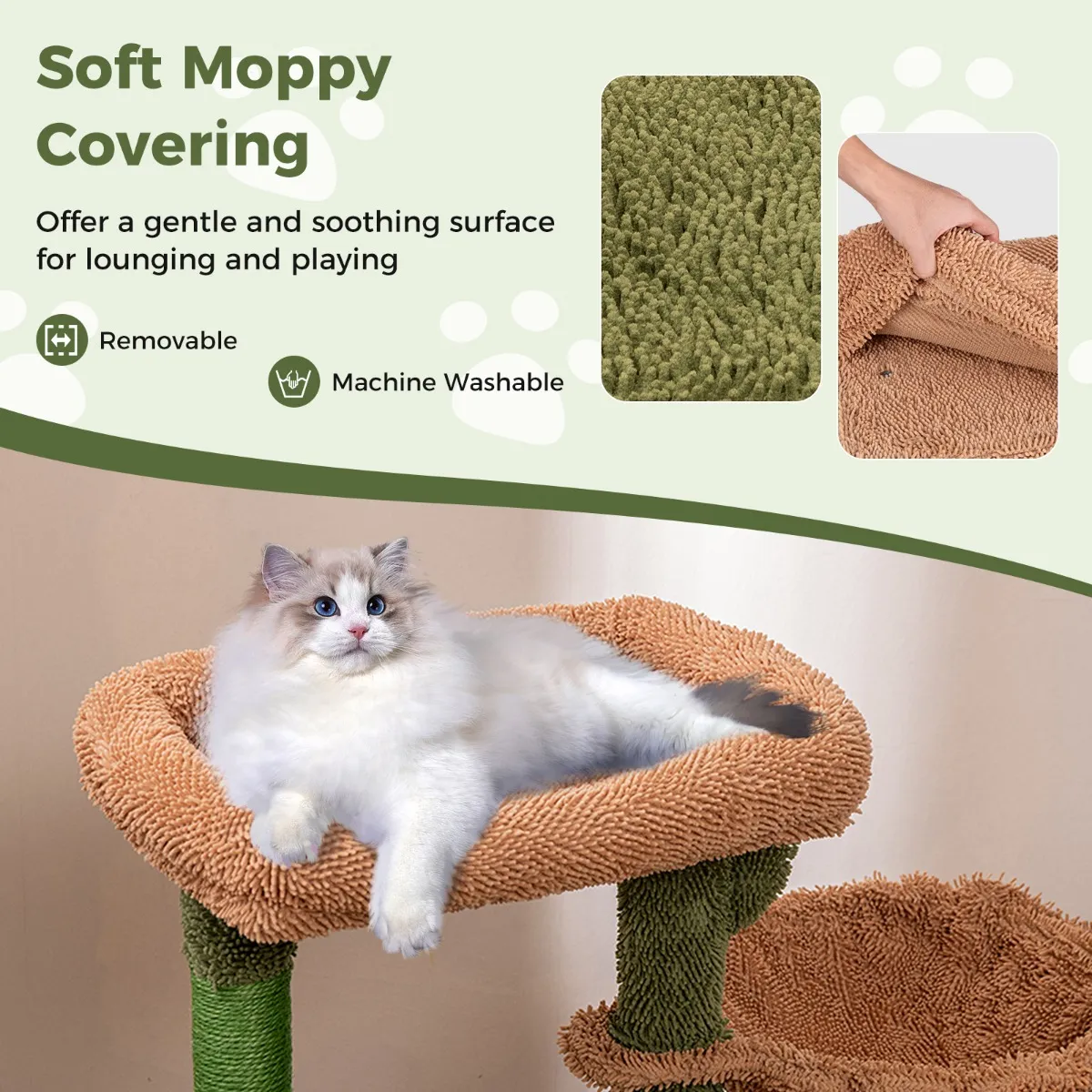 【Zacht comfort】 De krabpaal is bekleed met zachte, warme stof en biedt een zacht, rustgevend oppervlak om in te luieren en te spelen. Bovendien is het gewatteerde zitkussen aan de bovenkant afneembaar en machinewasbaar, voor een schone en hygiënische omgeving voor je schattige harige vrienden.