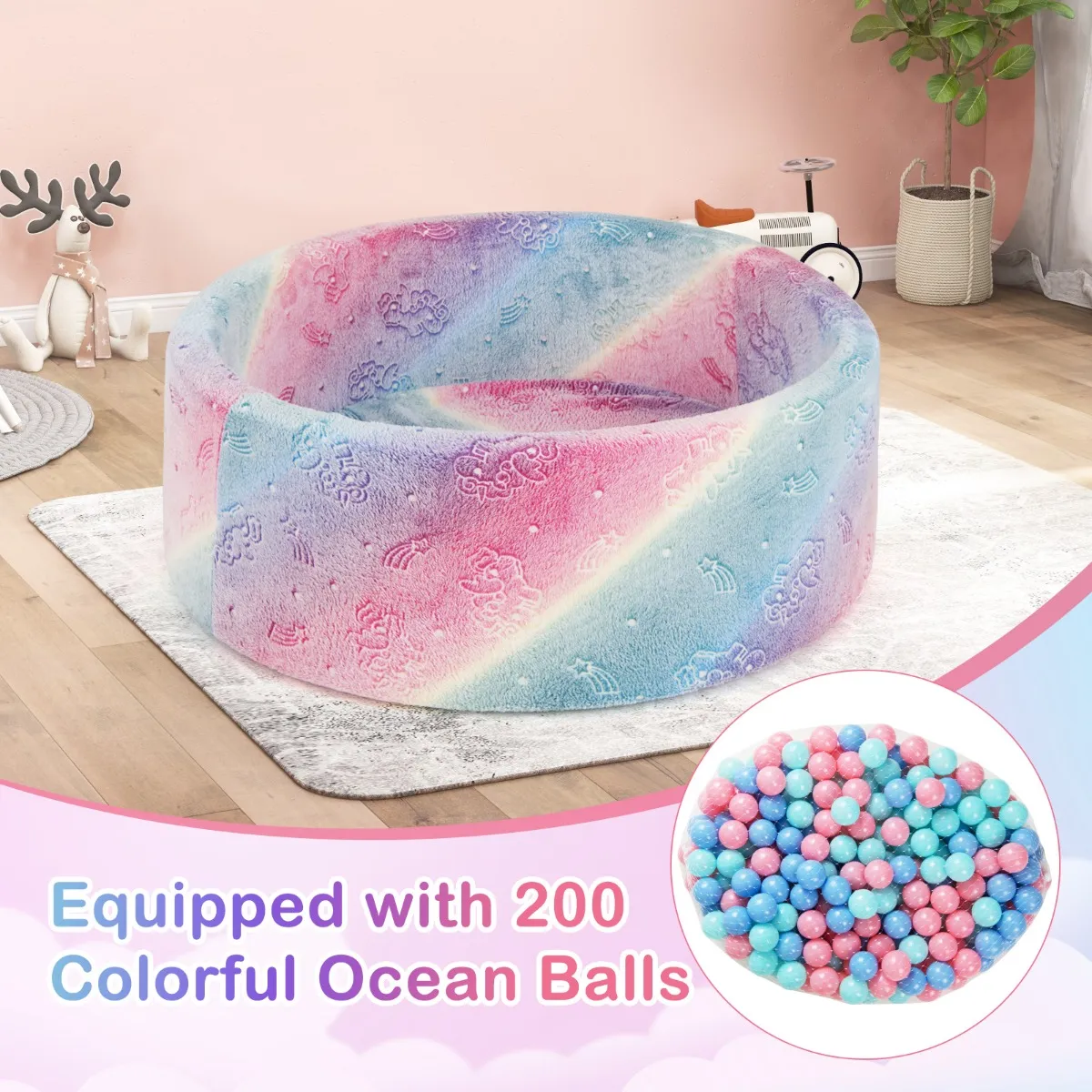 De zachte schuimrubberen ballenbak voor baby’s is bekleed met zachte flanellen stof en gevuld met veerkrachtig schuim, waardoor een veilige en comfortabele plek voor kinderen ontstaat. Wanneer ze worden blootgesteld aan fel licht, lichten de schattige patronen op in het donker, waardoor ze aantrekkelijker worden voor de kleintjes. Deze ronde ballenbak bevat 200 kleurrijke oceaanballen voor een meeslepende speelervaring. Voor eenvoudig onderhoud is de hoes eenvoudig afneembaar dankzij de handige rits, die in de wasmachine kan. Een geweldig cadeau voor peuters.