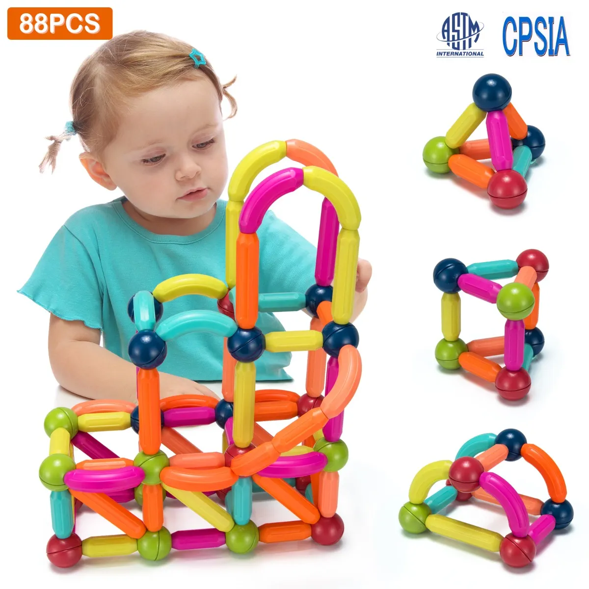 【Interessante speelgoedset】 88 stuks magnetische ballen en staven set bestaat uit 18 lange staven, 32 korte staven, 16 gebogen staven en 22 ballen. Bovendien, wij ontwerpen het ook met heldere kleuren (oranje, donkergroen, lichtgroen, roze, roze rood, hemel-blauw en donkerblauw), die de ogen van kinderen kunnen vangen. Kinderen kunnen het gebruiken om verschillende 2D of 3D structuren te ontwerpen.
