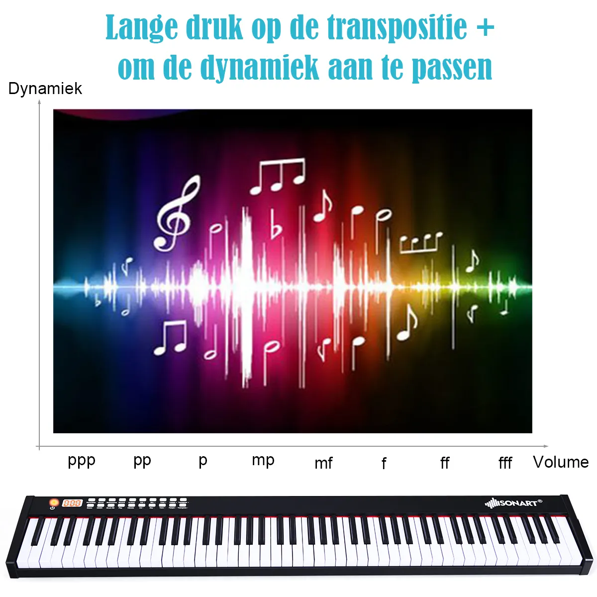 Gevoelige toetsen en dynamische aanpassing: De ABS-gewogen toetsen volgens de 1:1 pianotoetsverhouding zorgen voor een goede aanpassing aan de verandering van vingerdruk. Dynamische aanpassing is eenvoudig uit te voeren door lang op de Transpose+-knop te drukken.