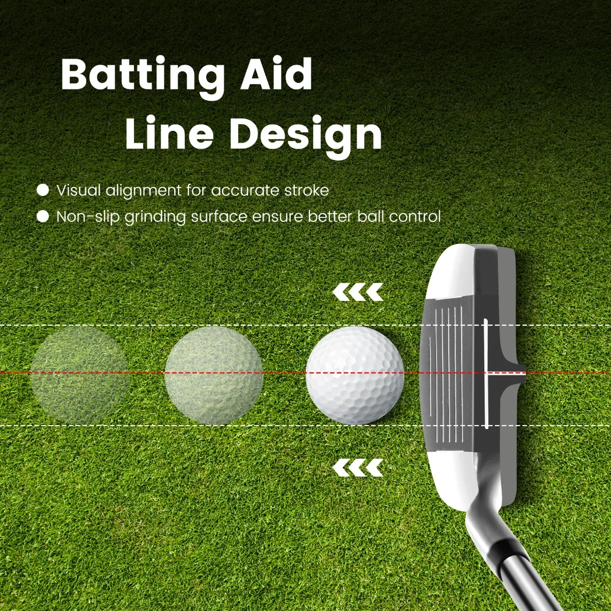 Nauwkeurige chip: Het antislip oppervlak zorgt voor een betere controle over de bal. Dankzij de nauwkeurige uitlijningslijn kun je je slagen heel eenvoudig op je doel richten. En het lage zwaartepunt maakt het mogelijk om probleemloos een mooie slag te bereiken.