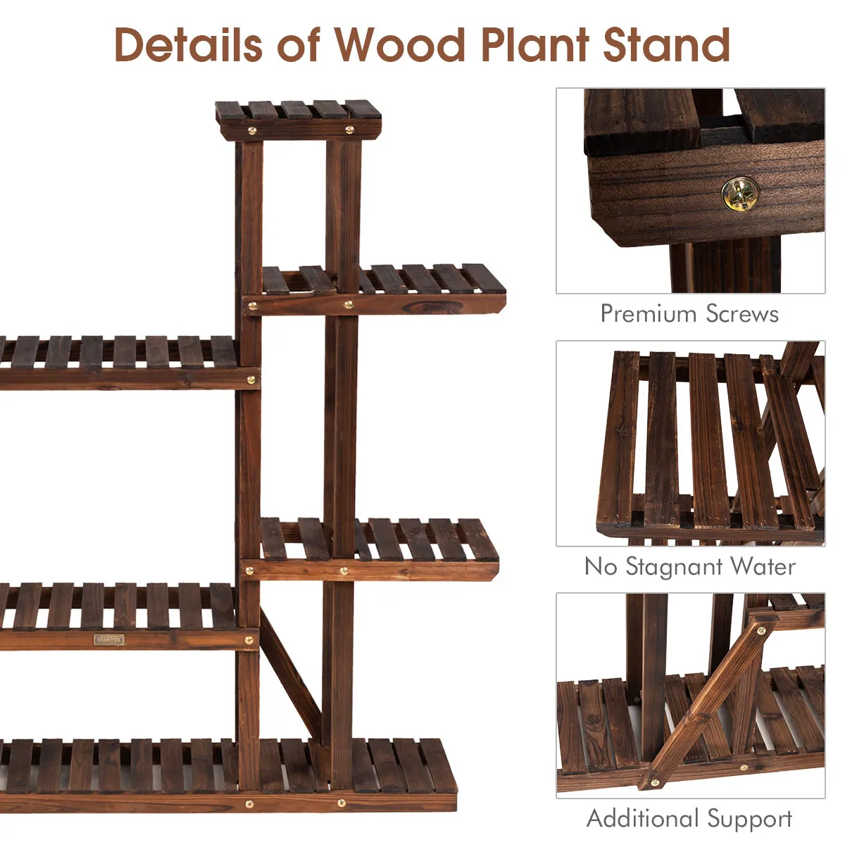 De plantenstandaard is stevig toe te schrijven aan premie stevige sparrenhout bouw. En deze plank is ook gecarboniseerd met op hoge temperatuur voor oud gebruik. Plus, de holle en verspreide planken van dit plantenrek zijn geweldig voor waterafvoer en ventilatie. Ontworpen met voldoende ruimte, kan het rek worden gebruikt om uw planten en allerlei voorwerpen te plaatsen die u wilt uitzetten en tonen voor binnen en buitenruimte. Het is geweldig voor het plaatsen in de woonkamer, balkon en patio waar u maar wilt. Het is ook gemakkelijk te onderhouden en te monteren deze stand nog meer wenselijk.