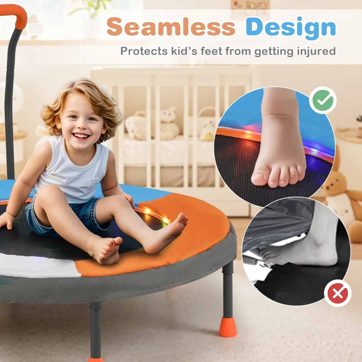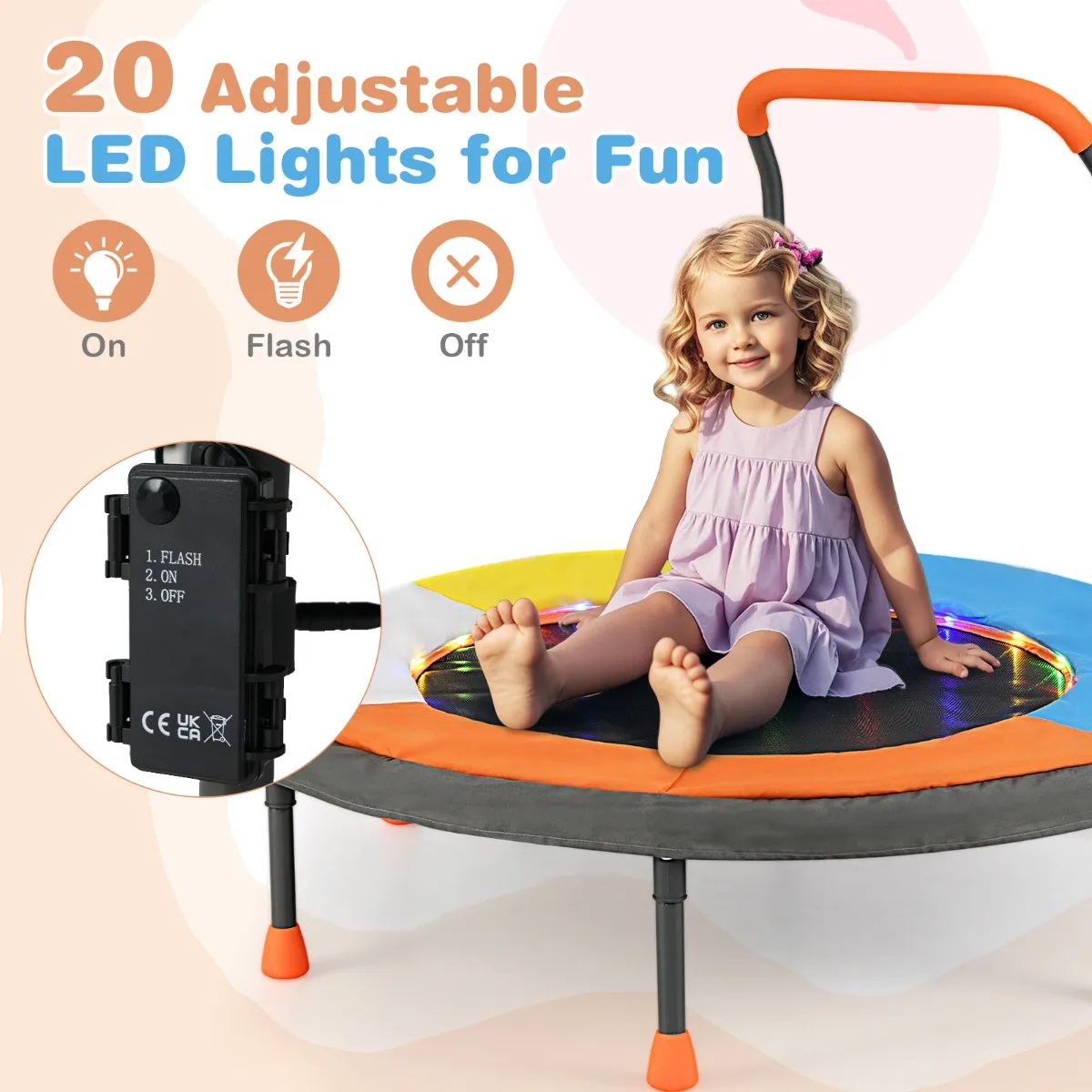 Spring voor plezier en gezondheid! De kleurrijke LED-lampjes op het springdoek bieden 3 verlichtingsstanden. Deze 90 cm minitrampoline voor kinderen is ontworpen zonder veren en maakt gebruik van 20 spanbanden voor een veiligere en gelijkmatigere veerkracht. Het gepoedercoate frame en de antislipvoetjes zorgen voor stabiliteit en duurzaamheid. Deze trampoline is eenvoudig te monteren en opvouwbaar voor opslag. Ideaal voor binnen- en buitengebruik. Kinderen van 3 tot 5 jaar kunnen er veilig en leuk op spelen.