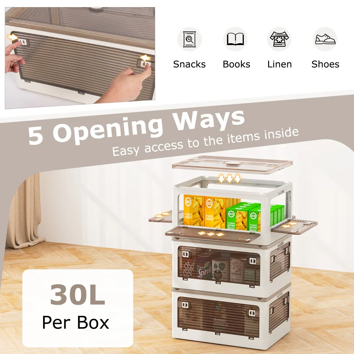 【Grote inhoud】: De opbergdozen bieden veel ruimte om moeiteloos alles van kleding tot verzamelstukken te organiseren. De royale inhoud van 30 L per container maakt hem tot de perfecte oplossing om elke ruimte in je huis van geurtjes of rondliggende kledingstukken te bevrijden.