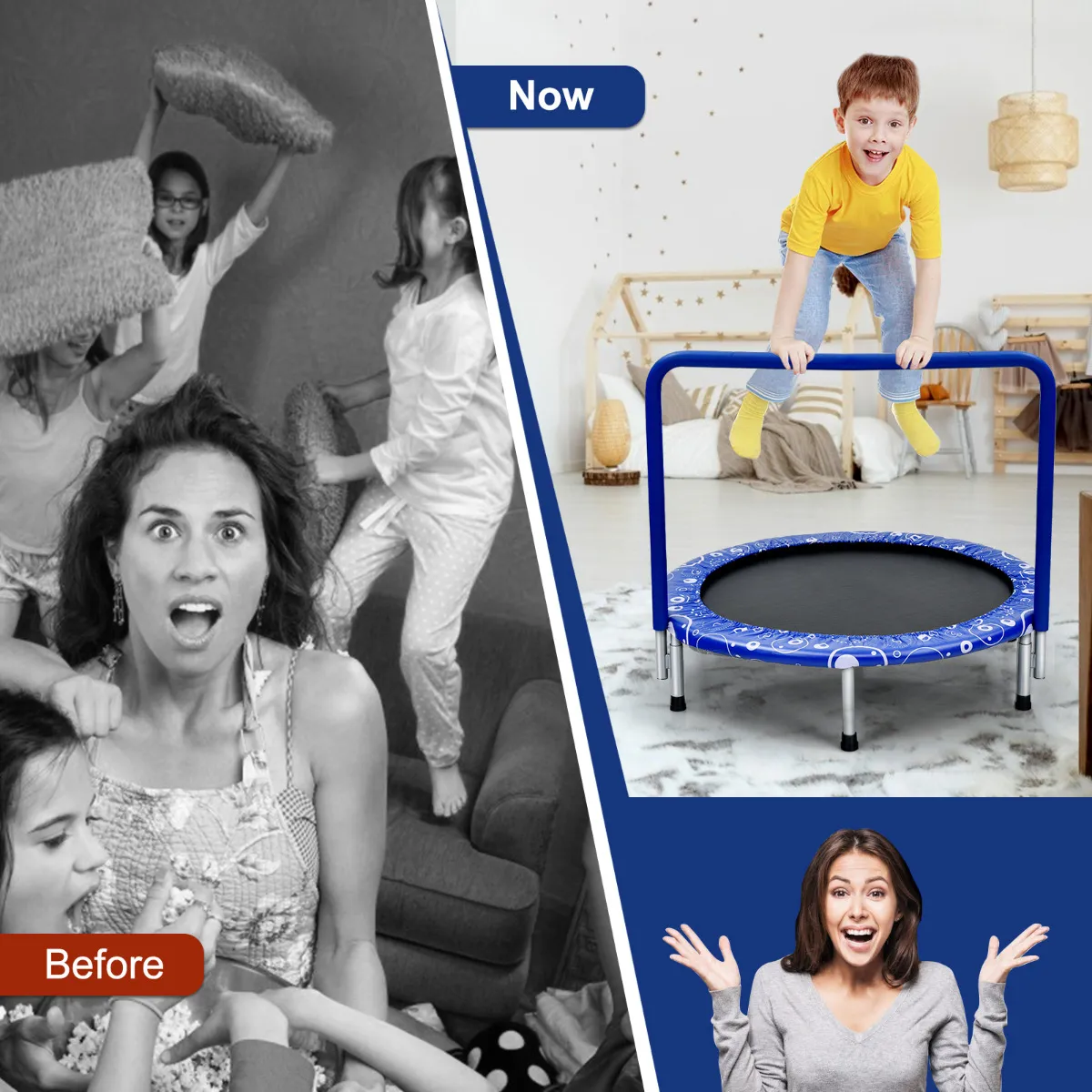 Ontworpen met hoog-elastische PP-mat, biedt deze peuter rebounder een uitstekende springervaring om de botgroei en de bloedcirculatie te bevorderen. Met het oog op de veiligheid van uw kinderen zijn de gevoerde veiligheidsafdekking en het volledig afgedekte handvat uitgerust om uw kinderen te beschermen. Terwijl hij/zij springt, voorkomen de stille bungeekoorden en anti-slip voetdoppen dat anderen hem storen. Na gebruik van deze minitrampoline kunt u hem opvouwen tot een compact formaat, zodat u hem gemakkelijk kunt verplaatsen en opbergen.