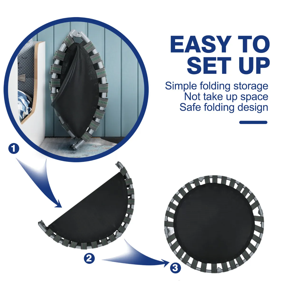 【Voor binnengebruik】Deze opvouwbare trampoline is stevig, stabiel en heeft een hoog draagvermogen tot 150 kg. Hij wordt aanbevolen voor gebruik binnenshuis.