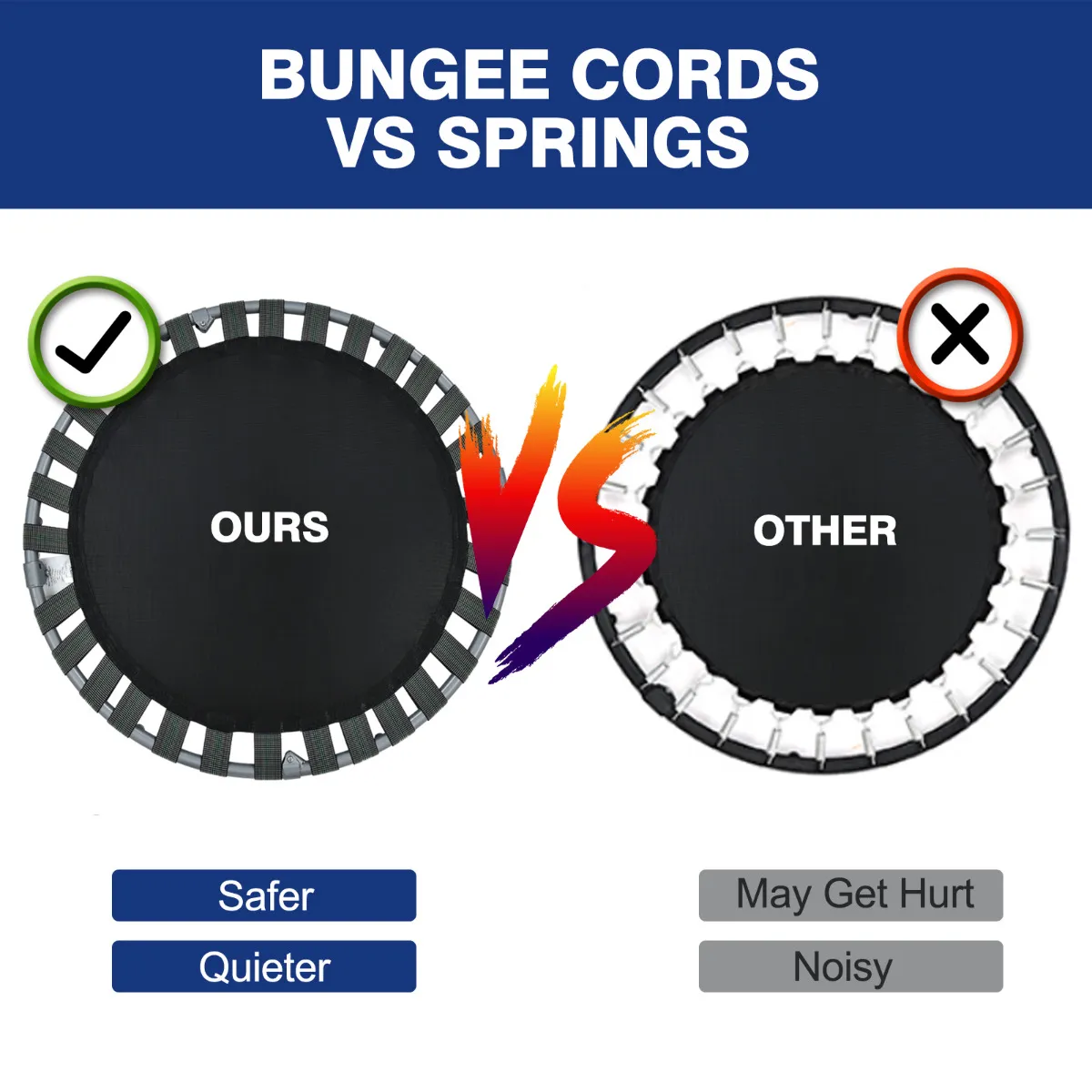 【Stil voor u】In tegenstelling tot andere trampolines die gebruik maken van veren, is deze peuter rebounder uitgerust met 30 duurzame bungee koorden die geen lawaai maken om anderen te storen. Ook de antislip rubberen voetdoppen voorkomen dat uw vloer bekrast wordt en zorgen voor een rustige omgeving.