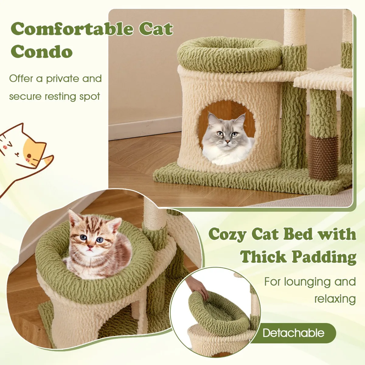 Onze 97 cm hoge kattenboom met meerdere verdiepingen beschikt over een pluchen condoom voor een rustig dutje, een luxueus gevoerd bed om in te ontspannen, een gezellige hangmat voor luie middagen en een zitstok om de kat te observeren. Uw kat zal dol zijn op de natuurlijke krabpalen van sisal. Ze stimuleren goede krabgewoonten en zorgen ervoor dat zijn klauwen gezond blijven. Dankzij de ingebouwde verzorgingsborstel kunnen katten genieten van een zachte massage, terwijl hun vacht schoon en verzorgd blijft. Dankzij de verfrissende groen-witte kleurstelling en de unieke textuur is deze krabpaal bovendien een stijlvolle decoratie die een vleugje elegantie toevoegt aan uw leefruimte.