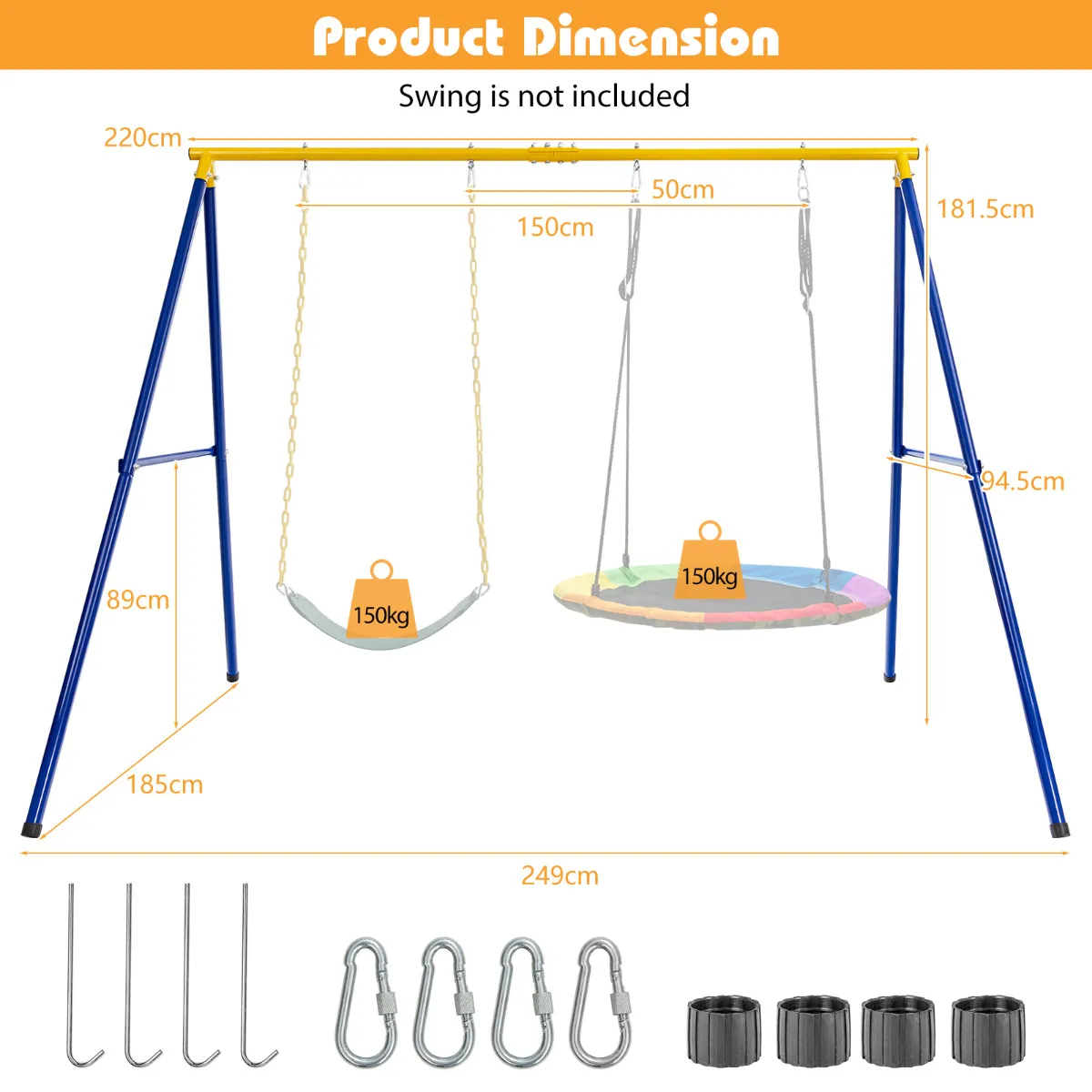 - Inbegrepen in de verpakking: 1 x Schommelframe standaard4 x Karabijnhaken4 x Grondpalen4 x Voetdoppen1 x Instructie