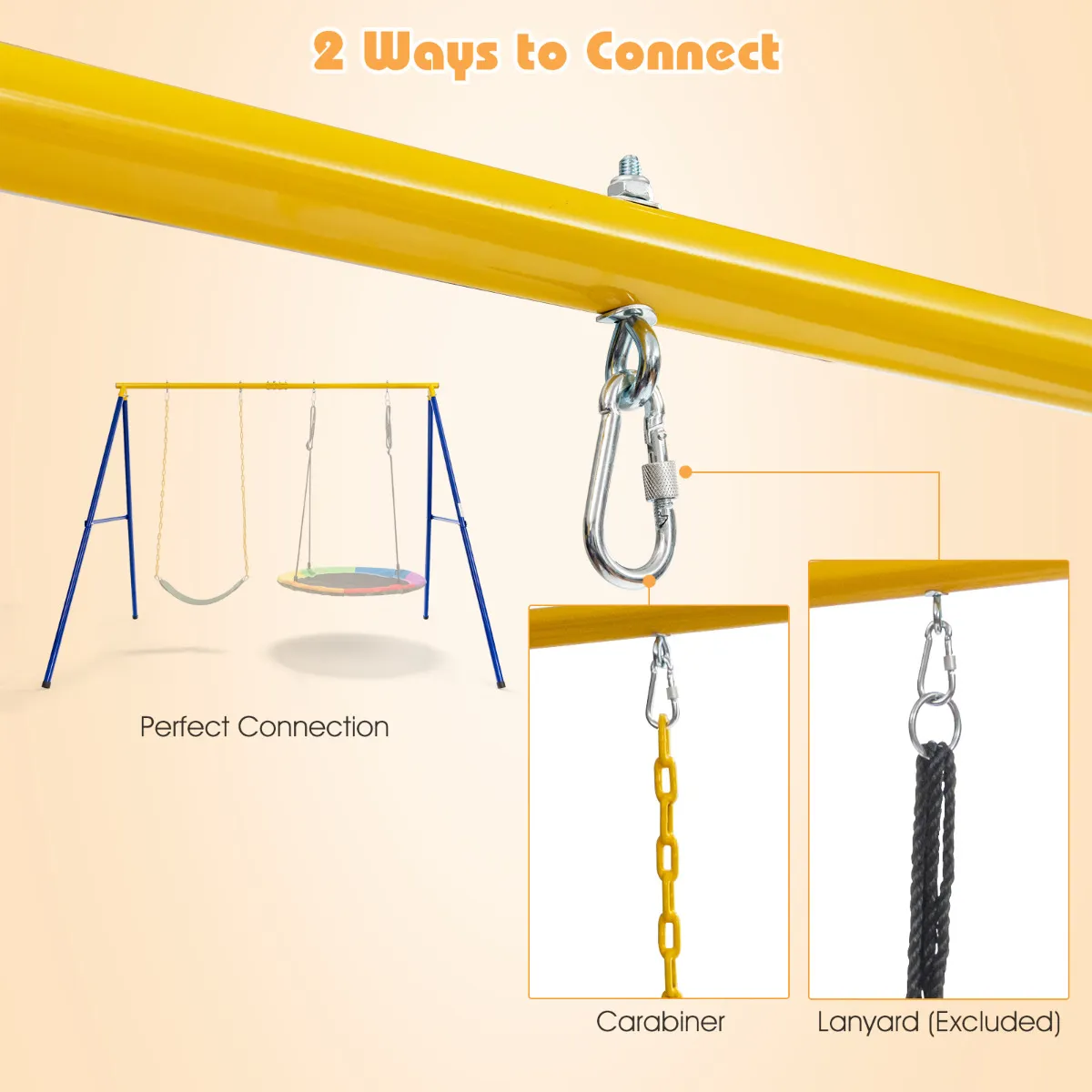 【2 Manieren om aan te sluiten】: 4 karabijnhaken zijn inbegrepen om handig aan het schommelframe te hangen. U kunt ook het sleutelkoord (niet meegeleverd) gebruiken om de schommel aan het frame te hangen en te genieten van het schommelplezier. Bovendien zijn 4 verwijderbare voetdoppen ontworpen om uw vloer te beschermen tegen krassen wanneer u deze schommelstandaard binnenshuis gebruikt.
