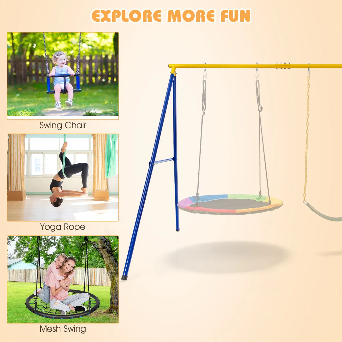 【Stabiel schommelframe】: Onze schommelstandaard past stevig A-frame ontwerp en versterkte verbindingen aan, die zorgen voor een hogere gewichtscapaciteit. Bovendien, versterkte centrumstructuur en 4 stevige grondpalen verhogen de algemene stabiliteit voor extra veiligheid. In tegenstelling tot normale plastic buizen, heeft onze stevige stalen buis een uitstekende stevigheid.