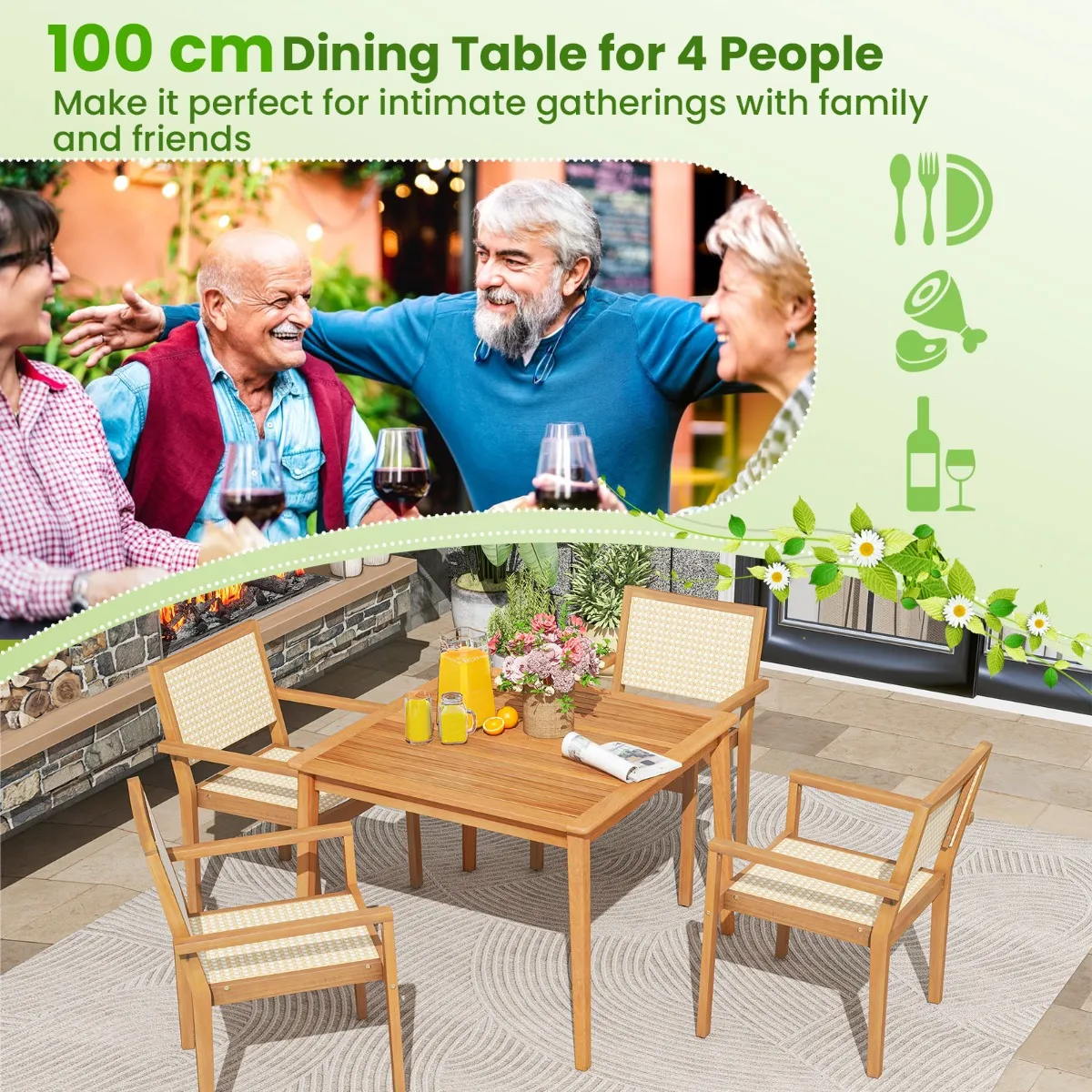 Deze vierkante bistrotafel van 100 cm is gemaakt van stabiel en duurzaam acaciahout en heeft een natuurlijke afwerking die de schoonheid van uw terras, balkon, tuin of binnenplaats versterkt en past bij zowel rustieke als moderne interieurstijlen. Deze houten tafel is ontworpen om comfortabel plaats te bieden aan 4 personen en is voorzien van een parasolgat van 100 cm, zodat u gemakkelijk schaduw kunt opzoeken.