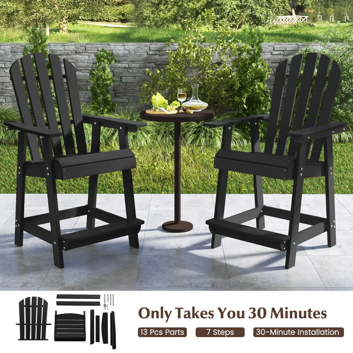 Veelzijdige stoelen en eenvoudige installatie: Niet alleen voor patio’s en veranda’s thuis, maar ook voor commerciële bars of cafés! Onze barstoelen onderscheiden zich in hun categorie door hun klassieke design en hoogwaardige materialen. Elke stoel bestaat uit 13 onderdelen die in 7 stappen kunnen worden geïnstalleerd, zodat de installatie in minder dan 30 minuten plaatsvindt.