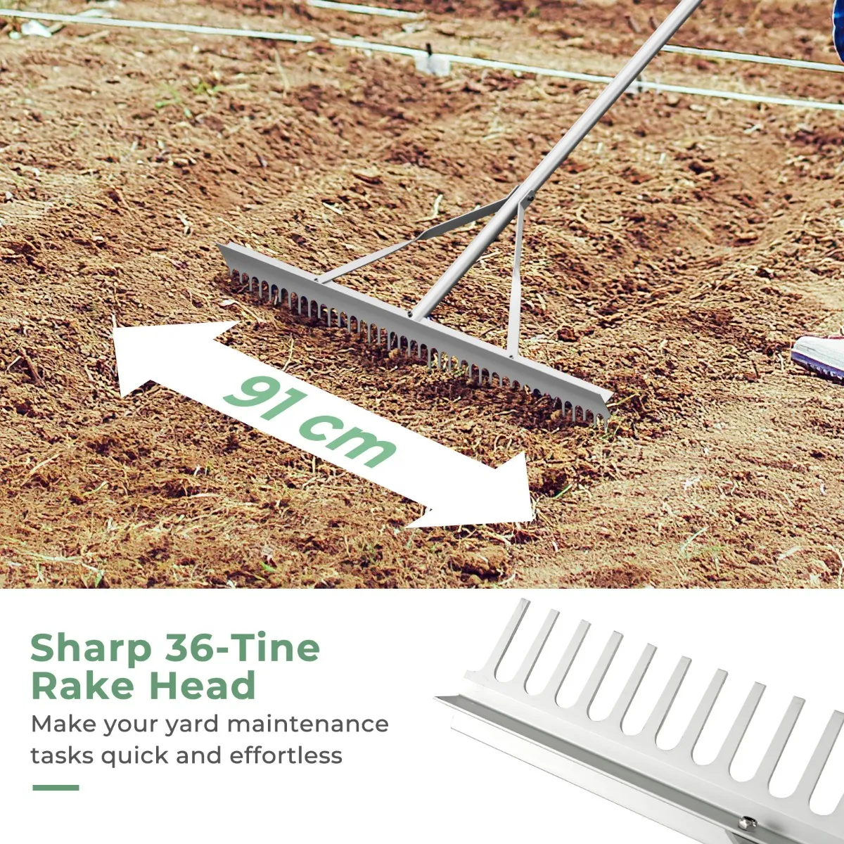 Brede harkkop & Lange steel: De aluminium hark heeft een 91 cm brede harkkop met 36 scherpe tanden, zodat je snel en moeiteloos je tuin kunt onderhouden. En hij heeft een 174 cm lange steel, die de druk op je middel en rug effectief vermindert.