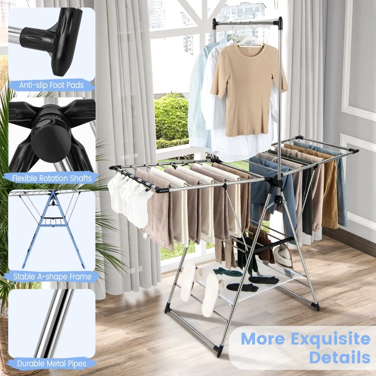 Multifunctioneel wasrek: Met 3 niveaus en een hoog hangerdesign biedt dit wasrek in vlinderstijl voldoende droogruimte voor je kleren, broeken, sjaals, speelgoed en handdoeken. Bovendien bieden de clips aan de zijkant en de 4 schoenenrekken extra ruimte voor sokken en slippers.