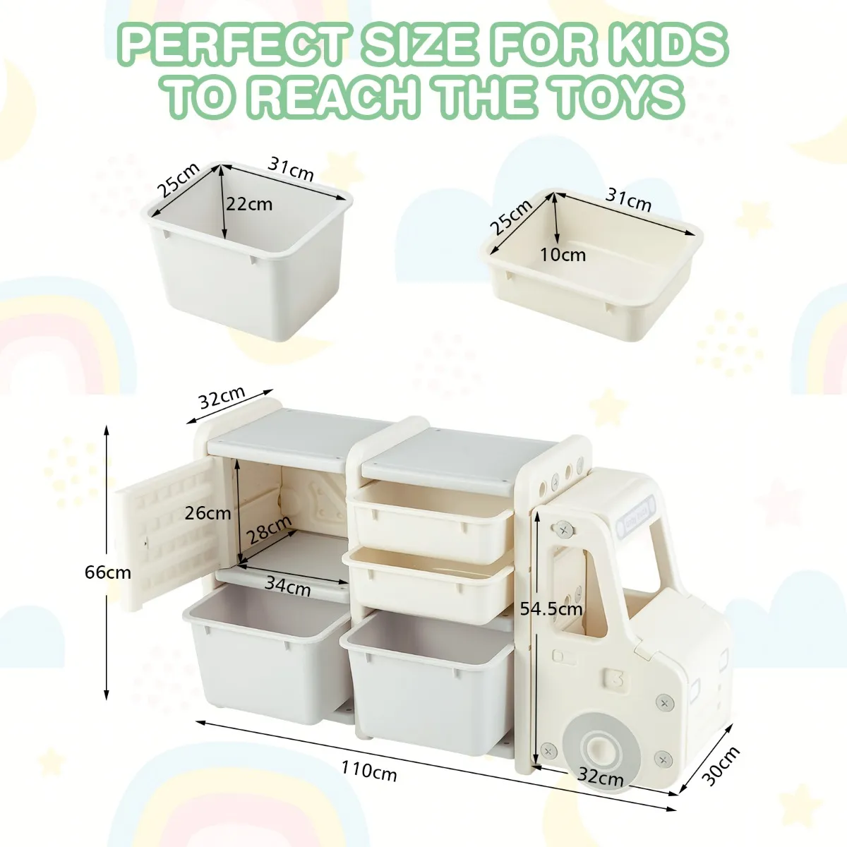Deze kinder-vrachtwagenkast biedt kinderen 2 grote opbergdozen, 2 kleine laden, een kast met één deur en een vrachtwagen-voor-opbergdoos, die allemaal een geschikte hoogte hebben, zodat peuters ze kunnen bereiken. Bovendien zijn de containers en laden uitneembaar, de kastdeur kan met een ronde handgreep gemakkelijk worden geopend en de vrachtwagenvoorkant beschikt over een afneembare afdekking. Dit alles garandeert een eenvoudige toegang en helpt kinderen om goede gewoonten te ontwikkelen. Zeg vaarwel tegen rommel. En de platen van de kast zijn met elkaar vergrendeld en worden door moeren bevestigd. Daarom kun je hem gemakkelijk in elkaar zetten, vooral als je een inbussleutel en een schroevendraaier nodig hebt.