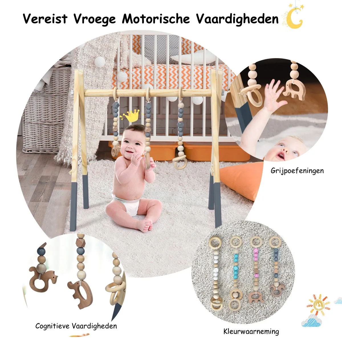 Eenvoudig opvouwbaar mechanisme: De houten opvouwbare speeltuin biedt u een handige opbergmogelijkheid wanneer u deze niet gebruikt. Je kunt het ook gemakkelijk losmaken, zodat je het hangende babyspeelgoed kunt veranderen of toevoegen voor meer variatie.