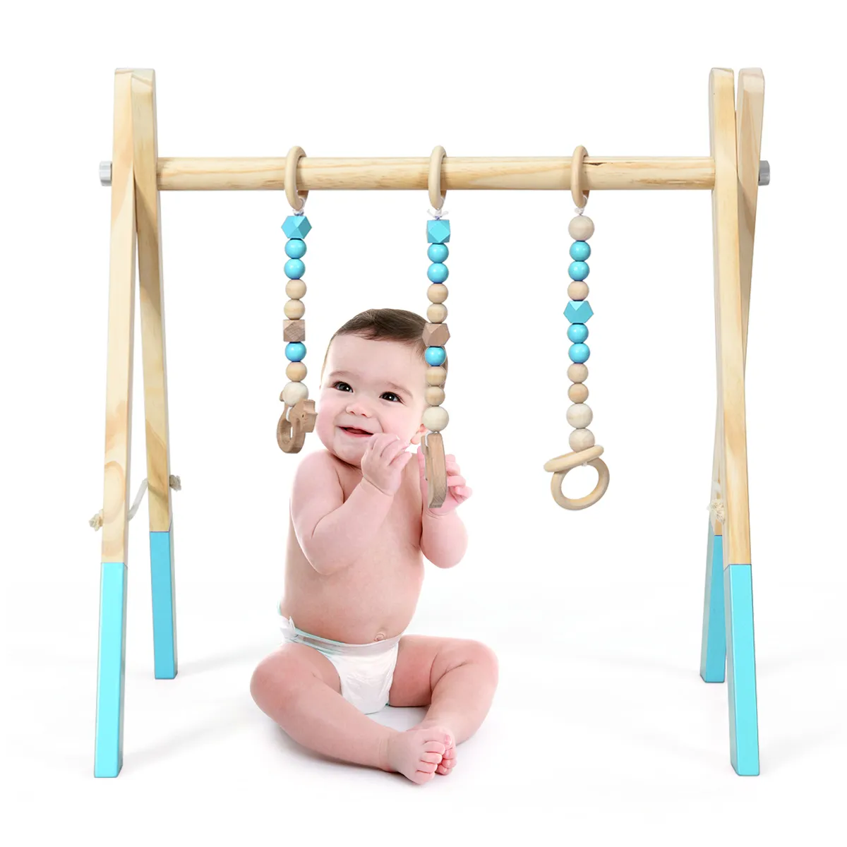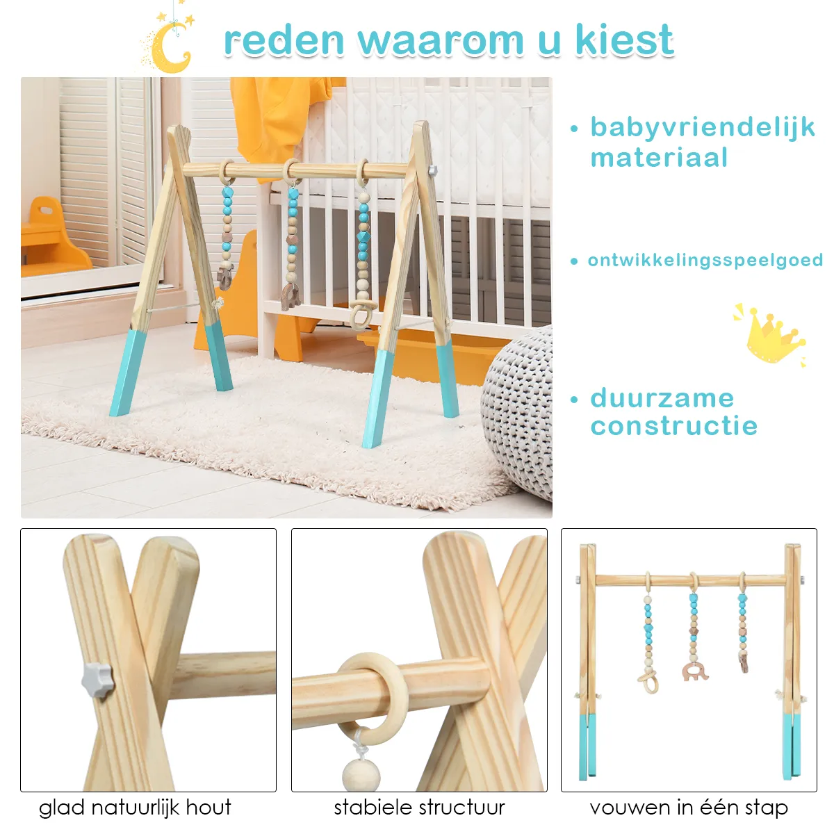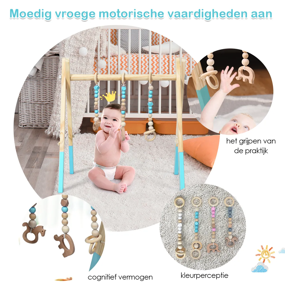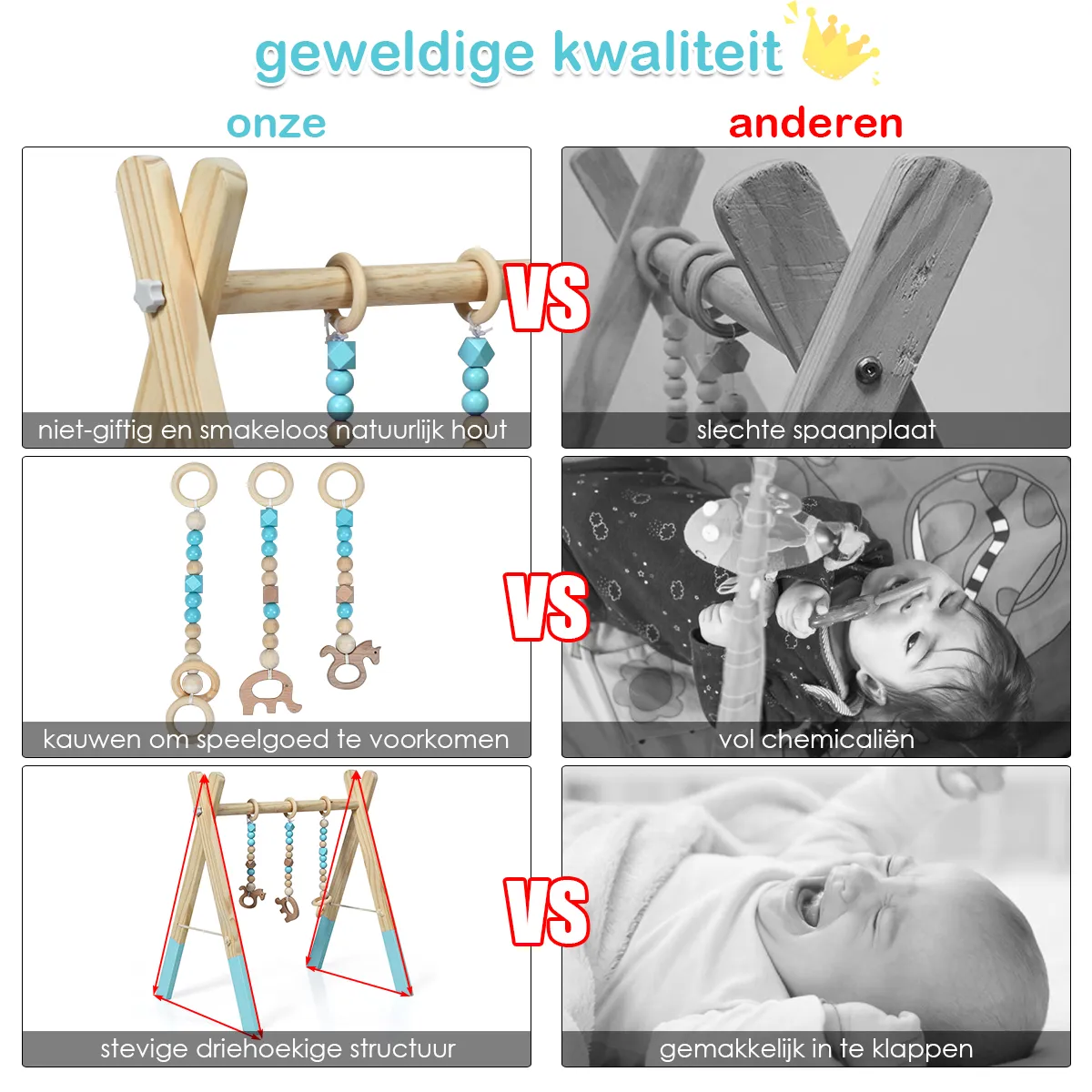 【Eenvoudig opvouwbaar en afneembaar ontwerp】 De houten speelgym met opvouwbare functie biedt een groot handig op te bergen wanneer niet in gebruik of wanneer de baby opgroeit. Het compacte formaat bespaart ruimte. Het is ook gemakkelijk los te maken, zodat u babyspeelgoed kunt wisselen of toevoegen om verschillende spellen te spelen.