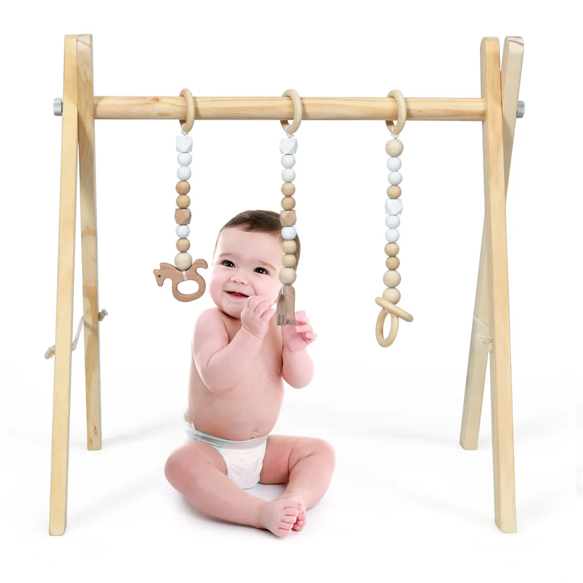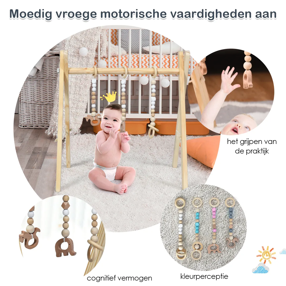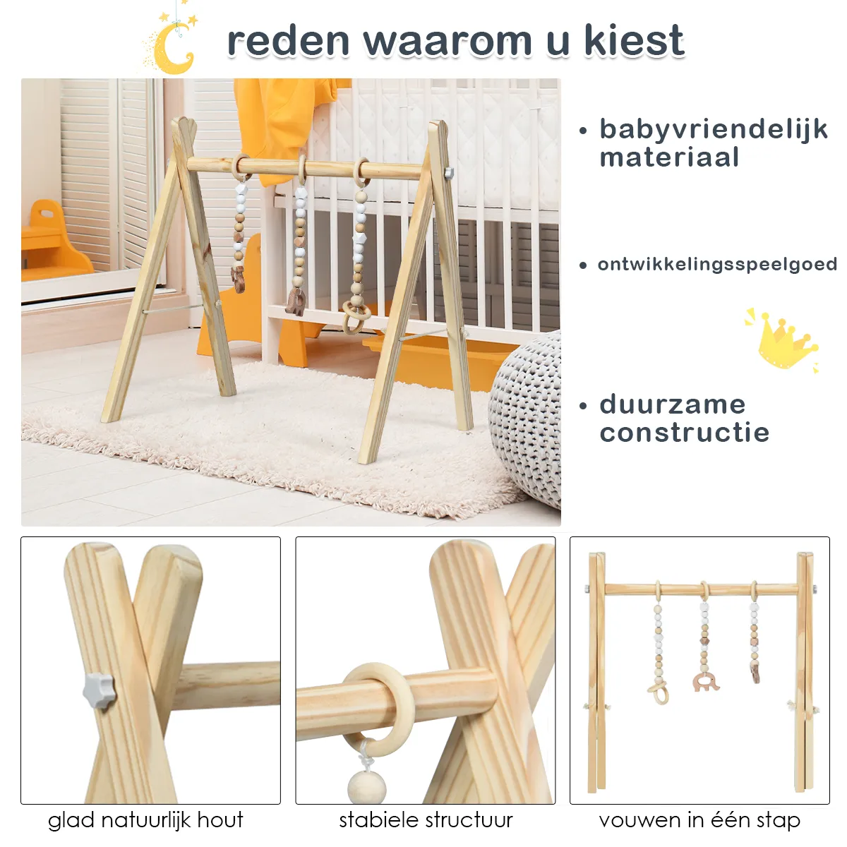 【Eenvoudig opvouwbaar en afneembaar ontwerp】 De houten speelgym met opvouwbare functie biedt een groot handig op te bergen wanneer niet in gebruik of wanneer de baby opgroeit. Het compacte formaat bespaart ruimte. Het is ook gemakkelijk los te maken, zodat u babyspeelgoed kunt wisselen of toevoegen om verschillende spellen te spelen.