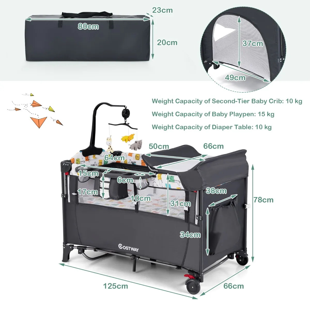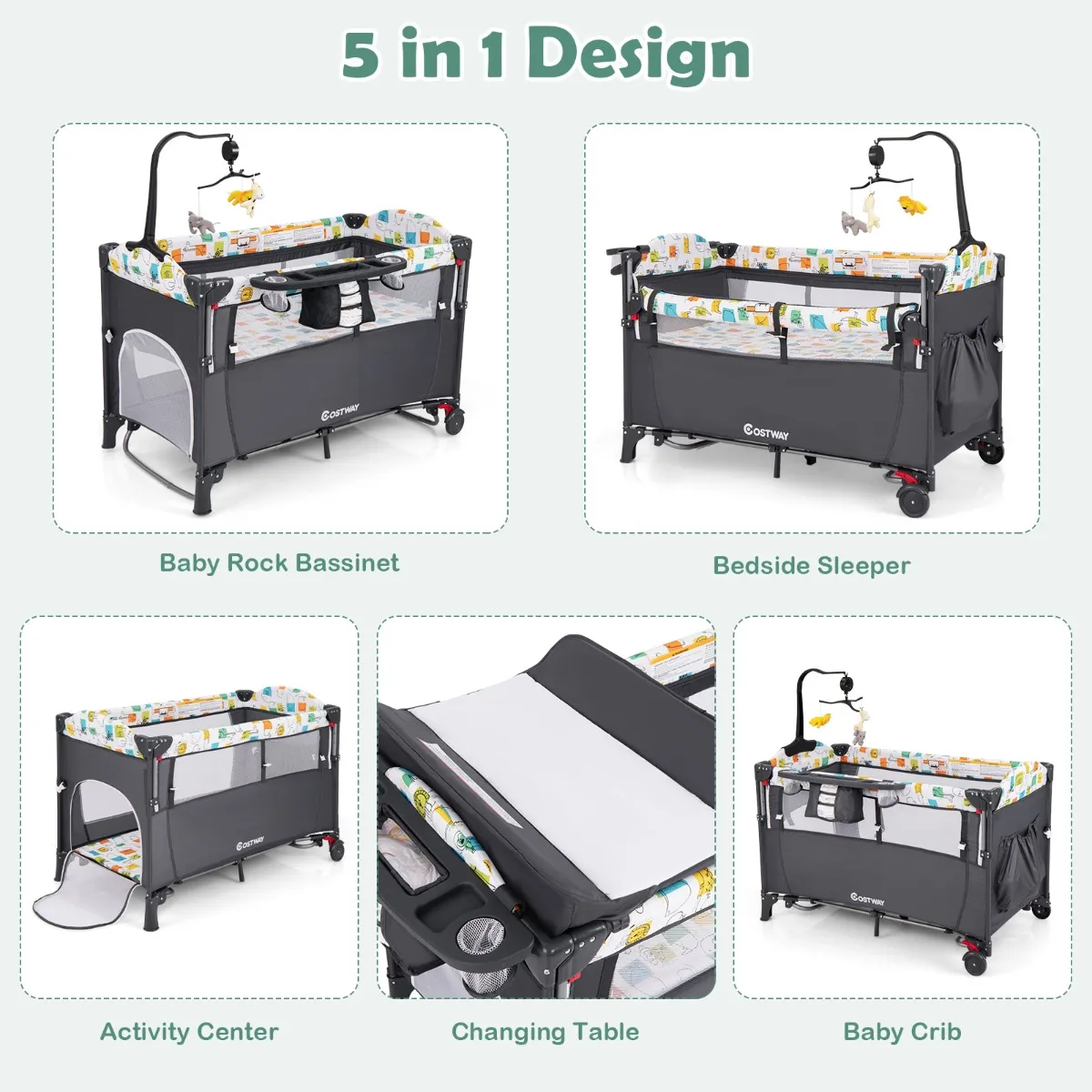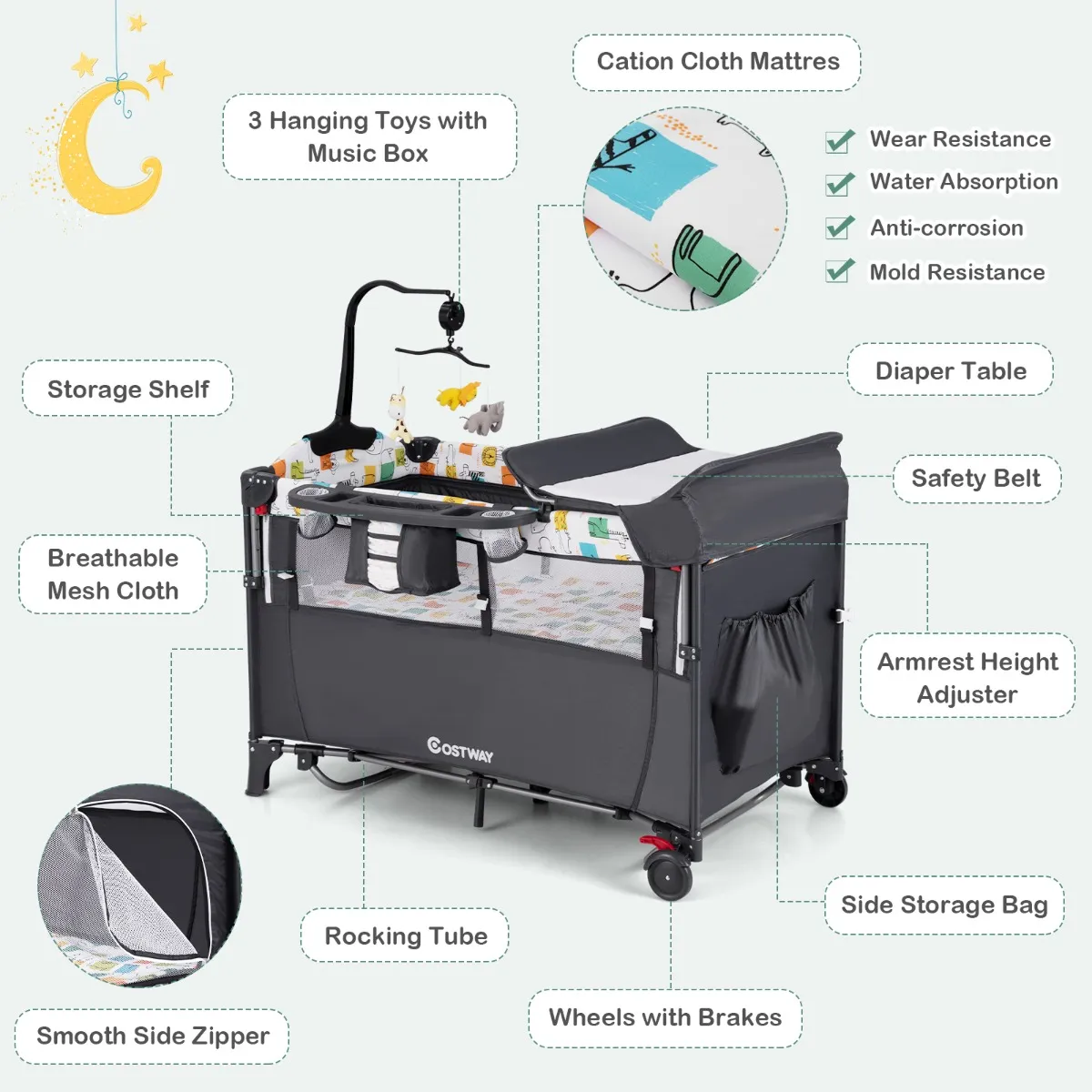 【5-in-1 Multifunctioneel ontwerp】: Dit multifunctionele babybed combineert met luier verschoontafel, bassinet, bed slaper, baby ledikant en activiteiten centrum, het voldoen aan uw verschillende behoeften. De 3 hangende speeltjes en het muziekdoosje brengen uw baby snel in slaap. De opbergzak kan op elke armleuning worden gemonteerd, perfect voor het opbergen van luiers, papieren handdoeken en andere benodigdheden.