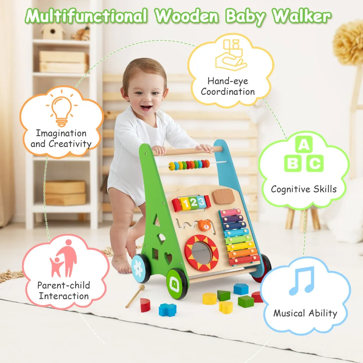 Deze staande hulp is bedoeld om baby’s het juiste te leren lopen. De gladde handgrepen en wielen garanderen een veilig gebruik. Met het all-in-one design kunnen peuters verschillende vreugde beleven. Je kunt genieten van het grappige labyrint, de vormsorteerder, xylofoon, parelspel en meer. Terwijl de blokken en de hamer voor eenvoudig gebruik zijn inbegrepen. Na het spelen houdt de opbergdoos aan de achterkant al het speelgoed binnen handbereik voor het volgende gebruik. Bovendien is de babyleerhulp ideaal voor de ontwikkeling van hand-oogcoördinatie, motorische vaardigheden, creativiteit en andere vaardigheden van kinderen. Daarom is het een perfecte cadeaukeuze voor jongens en meisjes.