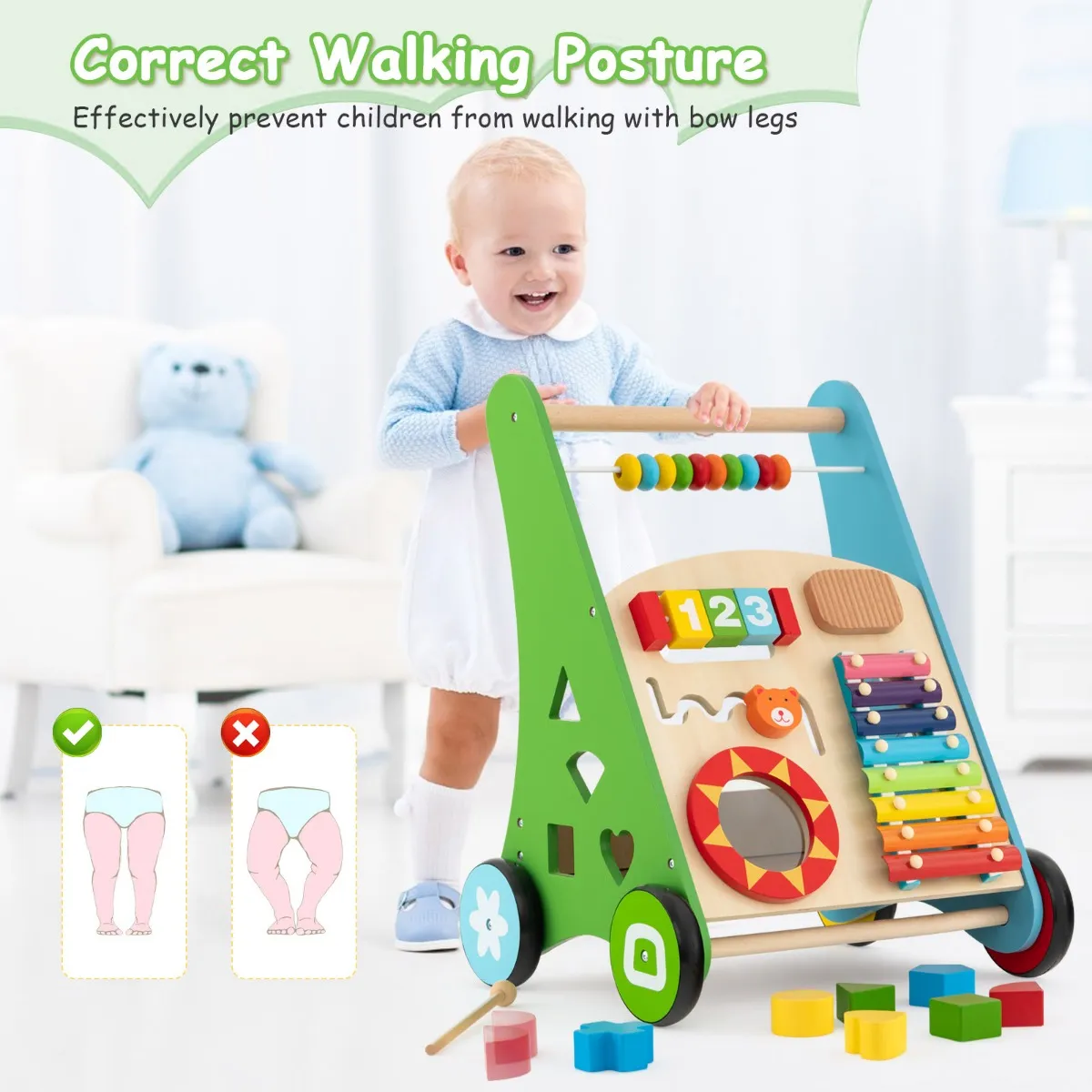 [Kindervriendelijke details] De veilige afgeronde hoeken en het kindvriendelijke design beschermen de gevoelige huid van de baby. En de hoogwaardige rubberen banden zorgen niet alleen voor soepel en veilig rollen, maar voorkomen ook krassen op de vloer.