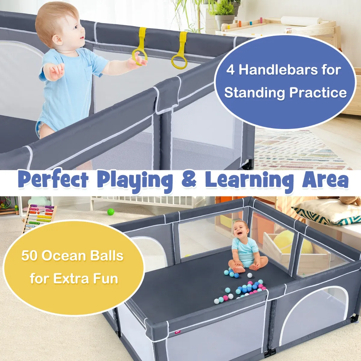 Onze extra grote baby speelbox is een ideale keuze voor kinderen om zich te vermaken en ouders om uit te rusten. Deze box heeft een speelruimte van 206cm (L) x 185,5cm (B) zodat kinderen vrij kunnen kruipen, zitten, lopen en spelen. We hebben de speelbox ontworpen met 50 kleurrijke ballen en 4 halters om kinderen te leren staan tijdens het spelen, en zo geest en lichaam samen te ontwikkelen. Bovendien zorgen anti-slip zuignappen ervoor dat hij stabiel blijft op verschillende soorten ondergrond. Het is uitgerust met een 360 graden zichtbaar net en een dubbele deur met rits. Dankzij het duidelijke instructieboekje en de eenvoudige structuur is hij gemakkelijk in enkele minuten te monteren en te demonteren.