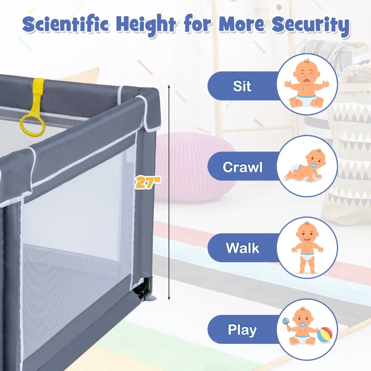 360 graden ontwerp en scharnierende deur: De vier wanden van deze speelbox zijn allemaal gemaakt van ademend, zichtbaar gaas, zodat je kinderen vanuit elke richting kunt zien en met ze kunt communiceren. Dubbele deuren met externe scharnieren zorgen voor een vrije in- en uitgang.