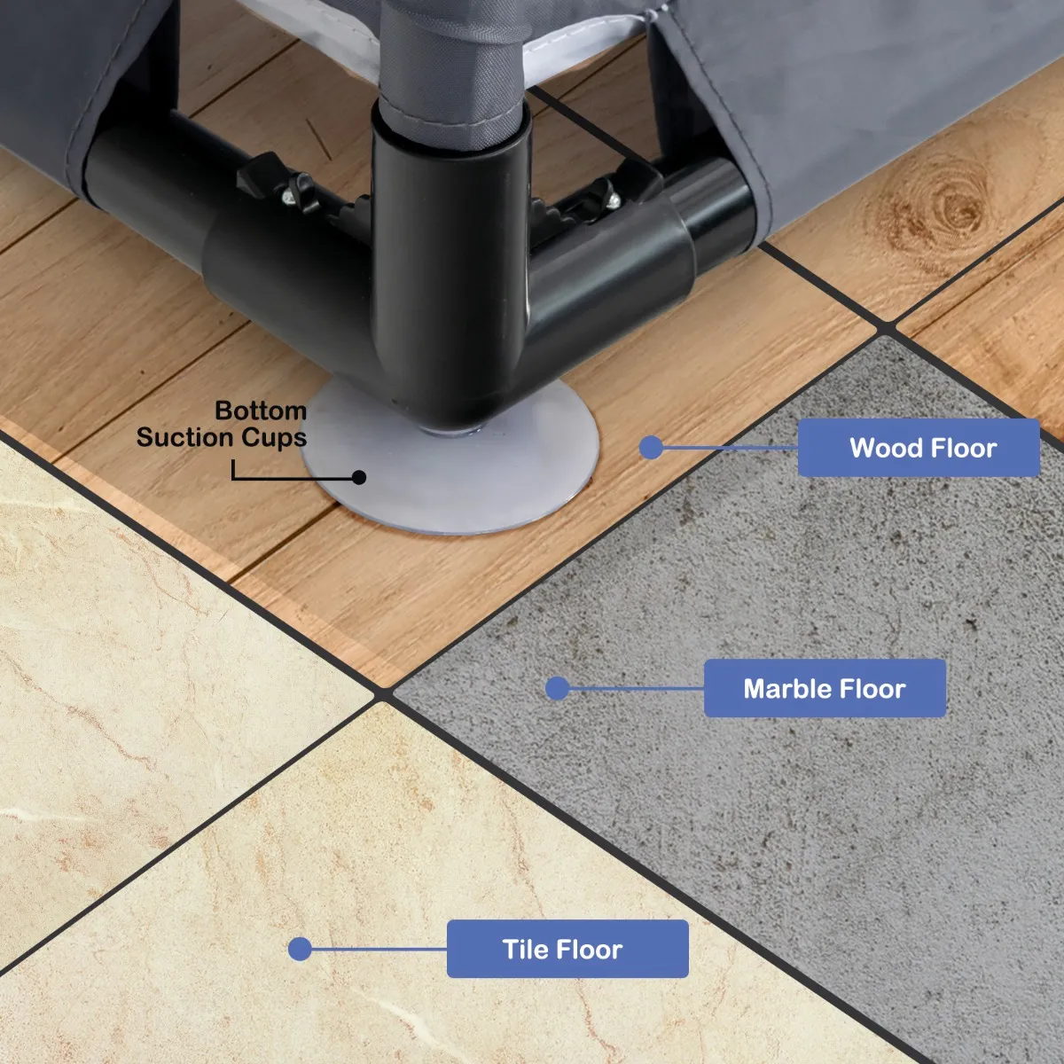 Veilig materiaal en anti-slip basis:Â Gemaakt van slijtvaste Oxford stof, deze speelruimte is ademend en veilig in gebruik. Om de veiligheid van kinderen beter te beschermen, is onze box volledig ingepakt in zacht doek zonder kieren. Dankzij de antislip zuignappen is onmogelijk om te kantelen als de speelbox eenmaal gemonteerd is.