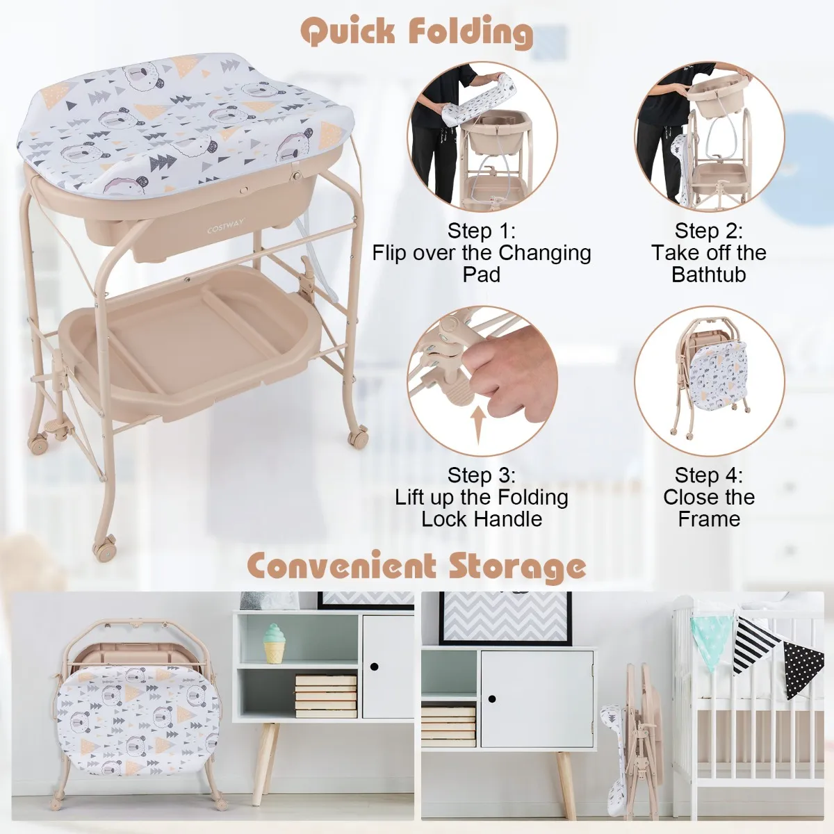【Beweegbaar en opvouwbaar ontwerp】: Het luierwisselstation is uitgerust met 4 universele wielen die helpen om het gemakkelijk van de ene plaats naar de andere te verplaatsen. Ook kunnen alle 4 wielen worden vergrendeld voor extra stabiliteit en veiligheid. Bovendien kunt u het luierwisselstation in enkele stappen opvouwen voor een gemakkelijke opslag.