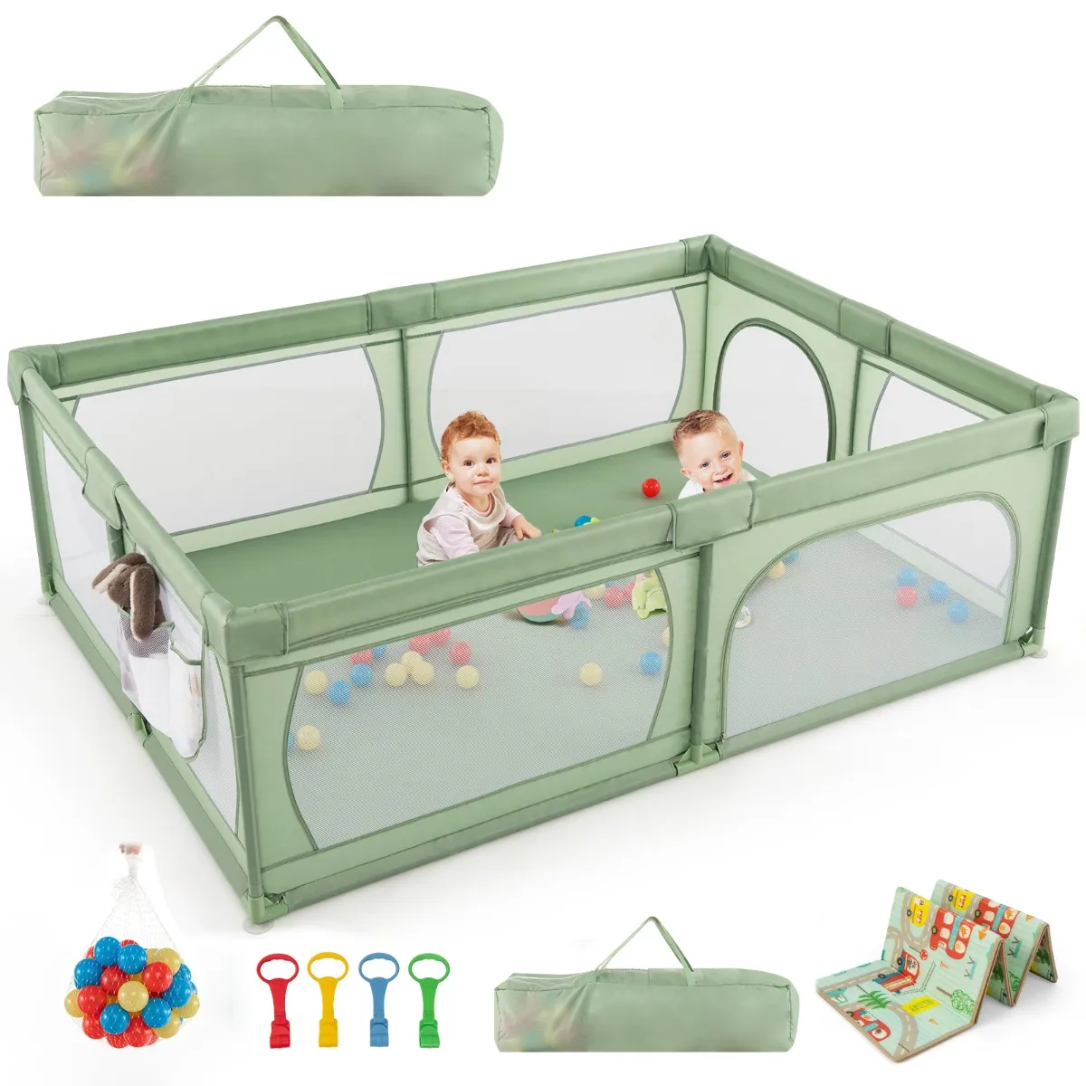 Onze box is gemaakt van hoge kwaliteit oxford stof, niet giftig en geurloos. Het biedt een grote ruimte voor kinderen om te spelen, rennen, staan, kruipen en slapen. Dankzij de ritssluiting kan het kind de box niet verlaten en is het beschermd. Dankzij de ademende netstof is het kind altijd in het zicht van de ouders.