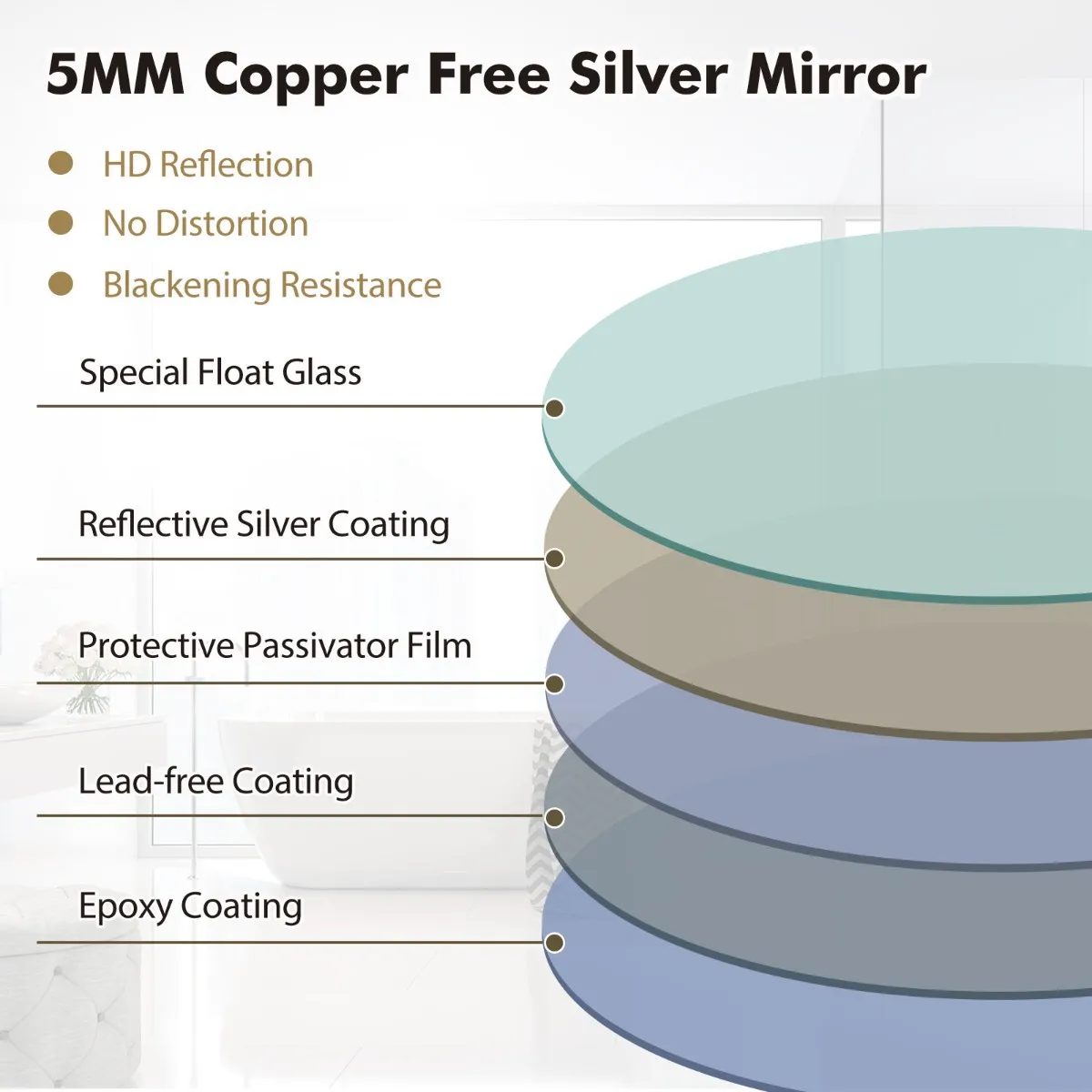 【Kristalheldere reflecties】: Ervaar HD-reflecties met realistische kleuren en zonder vervorming, dankzij de hoogwaardige 5mm kopervrije zilveren spiegel. De robuuste constructie van deze frameloze spiegel zorgt niet alleen voor een helderder beeld, maar verlengt ook de levensduur met een grotere weerstand tegen verduistering.
