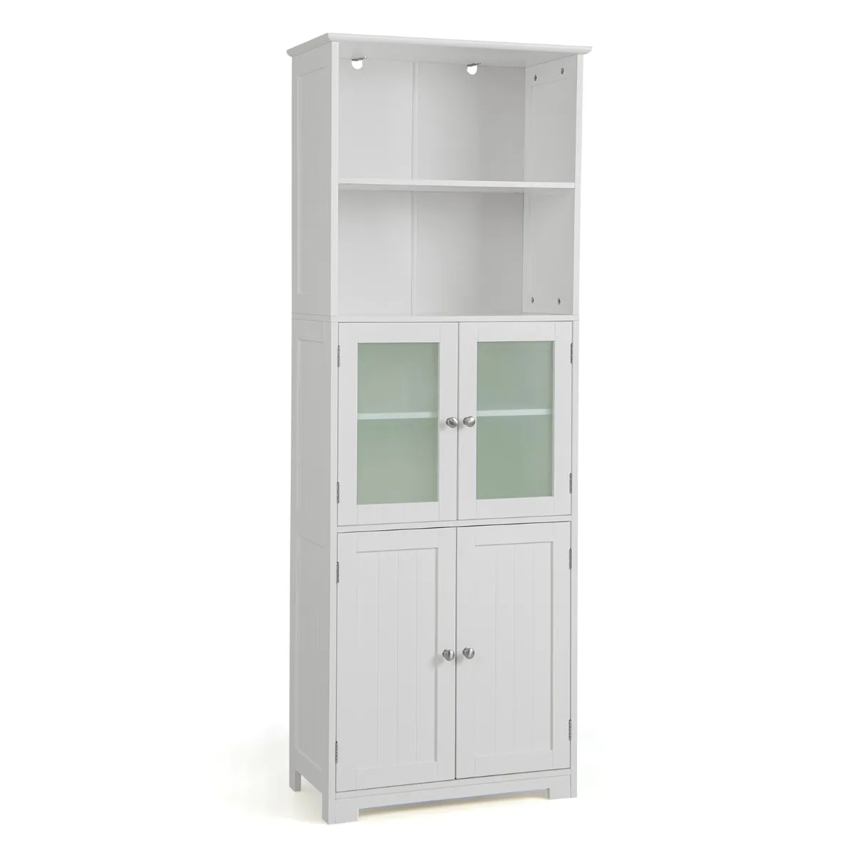 6 verdiepingen gesloten en open opbergruimte: uitgerust met 2 etages open opbergvakken en 2 kasten met deuren biedt deze hoge badkamerkast veel opbergruimte om verschillende voorwerpen goed georganiseerd te houden. Bovendien zijn er twee 3-voudig verstelbare planken, waarmee je de opbergruimte binnenin naar behoefte kunt aanpassen.