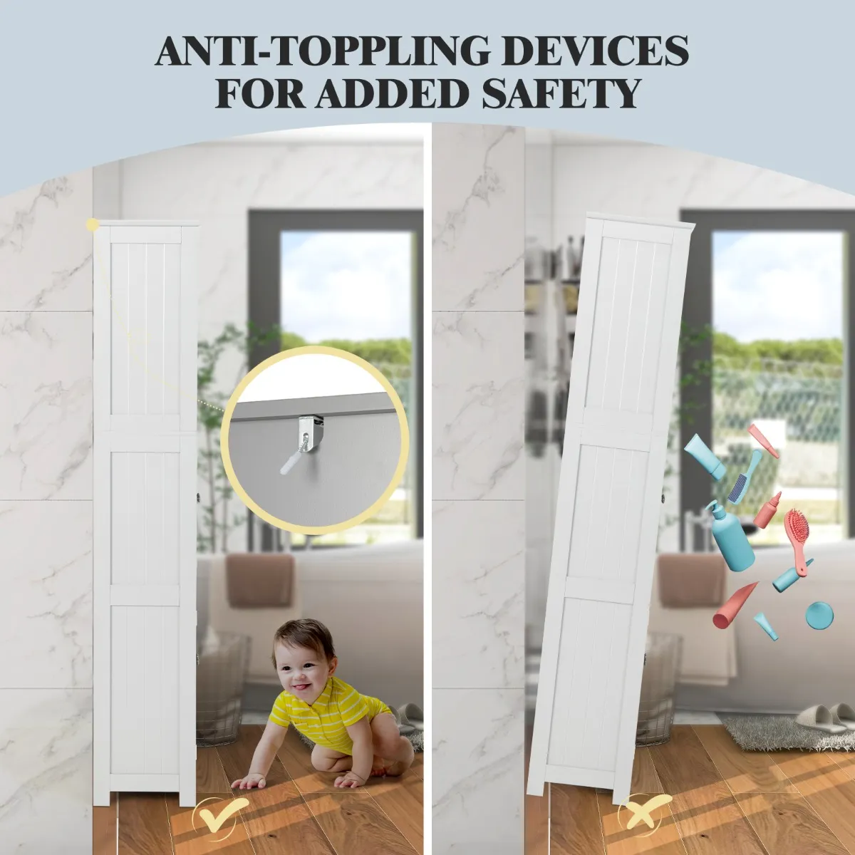 Probleemloze montage en eenvoudige reiniging: deze vrijstaande badkamerkast wordt geleverd met genummerde onderdelen en gemakkelijk te begrijpen instructies om de montage kinderspel te maken. Bovendien kan het gelakte oppervlak gemakkelijk met een vochtige doek worden afgeveegd en 4 stabiele poten helpen om de vloer gemakkelijk te bereiken voor het reinigen.