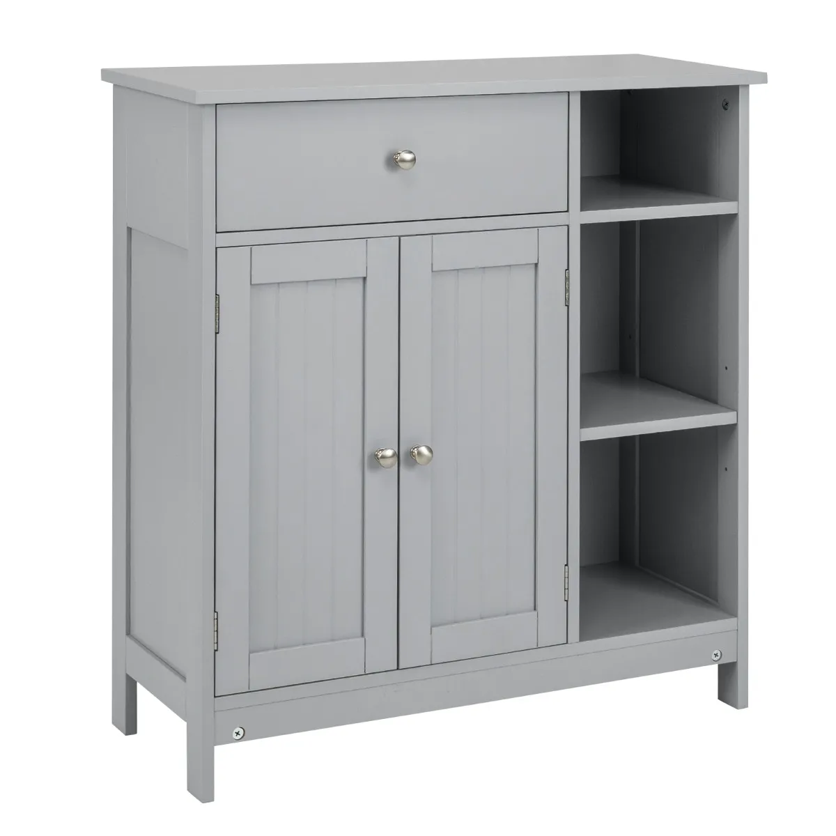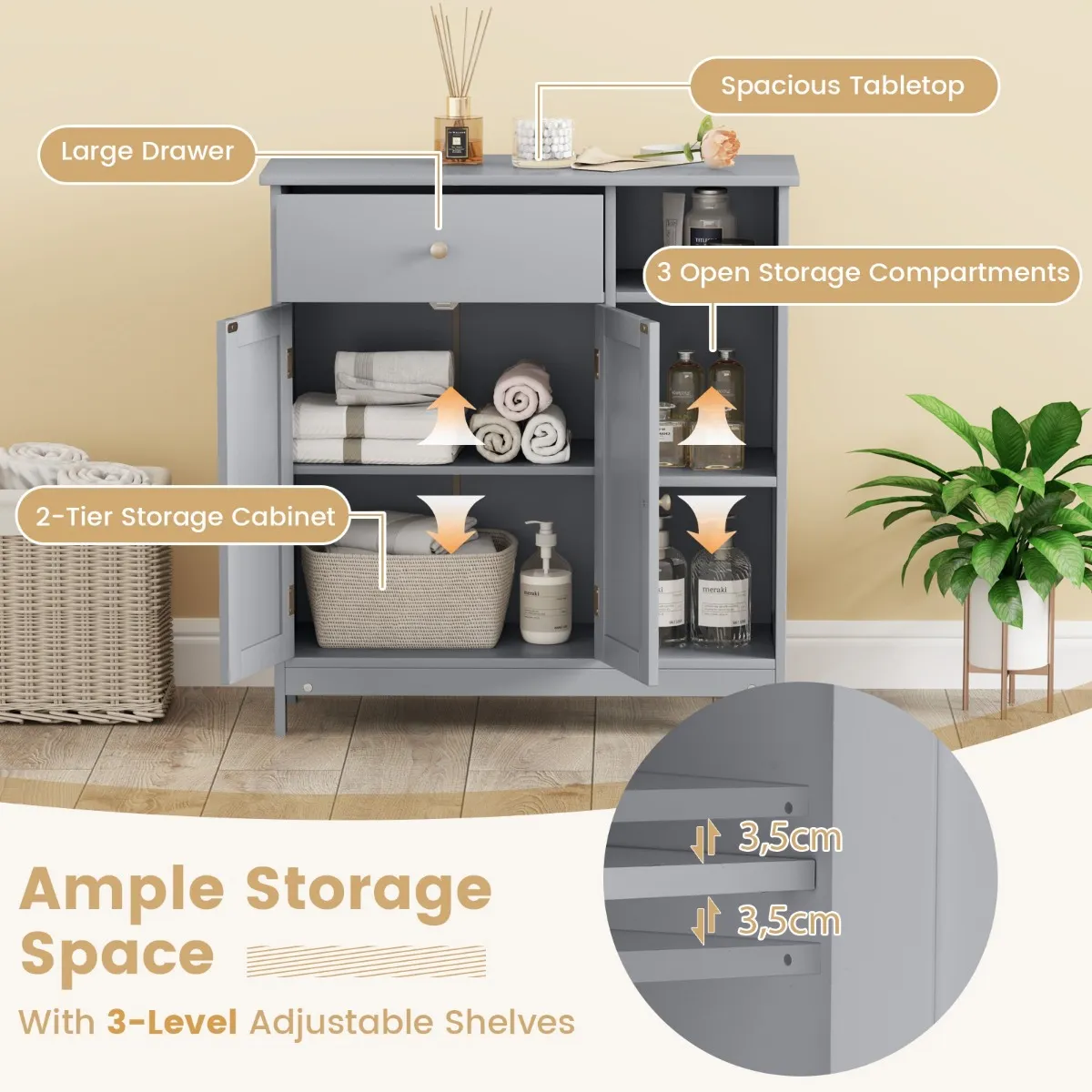 Deze vrijstaande badkamerkast combineert open en verborgen opbergruimte om aan je verschillende opbergbehoeften te voldoen, waaronder een grote lade, een kast en 3 open opbergvakken. Bovendien is het rek aan de binnenkant van de kast drievoudig in hoogte verstelbaar, zodat het geschikt is voor voorwerpen met verschillende hoogtes. Om veiligheidsredenen is deze kast uitgerust met een metalen ladegeleider en een kantelbeveiliging om kinderen tegen onnodige ongelukken te beschermen.