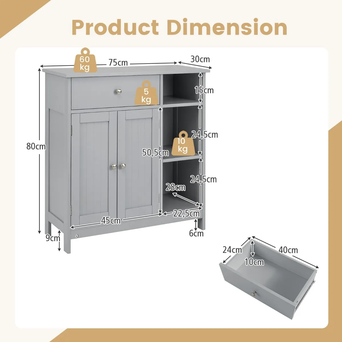 - Totale afmetingen: 75 x 30 x 80 cm (l x b x h)