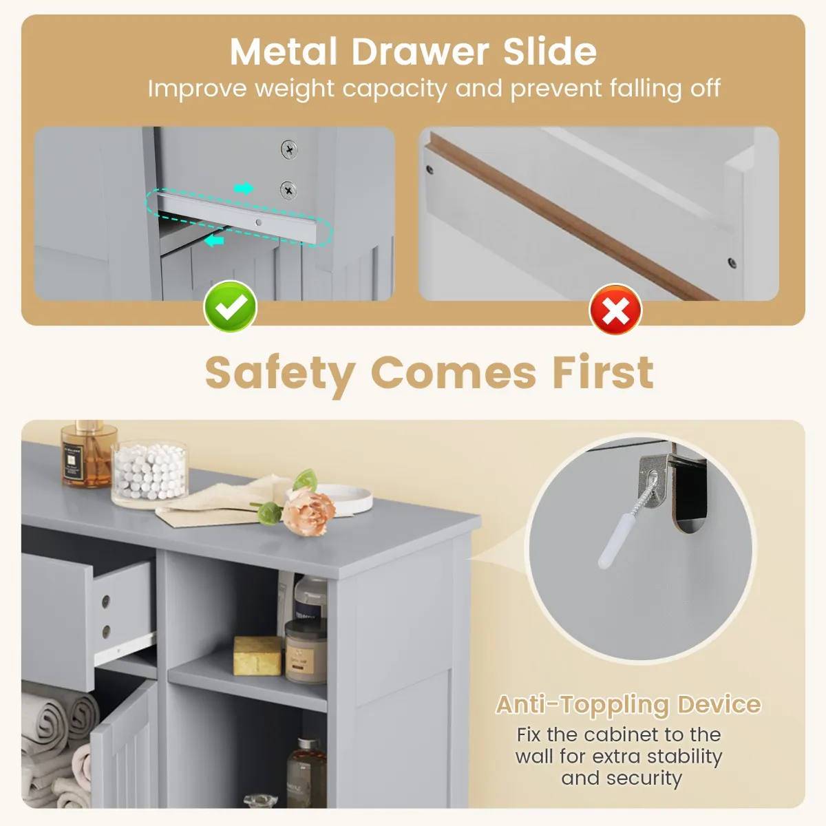 Veiligheid staat op de eerste plaats: De metalen lade verbetert het draagvermogen en voorkomt dat de lade eraf valt als de kast omvalt. Bovendien kun je de kast voor extra stabiliteit en veiligheid met de meegeleverde kantelbeveiliging aan de muur bevestigen.