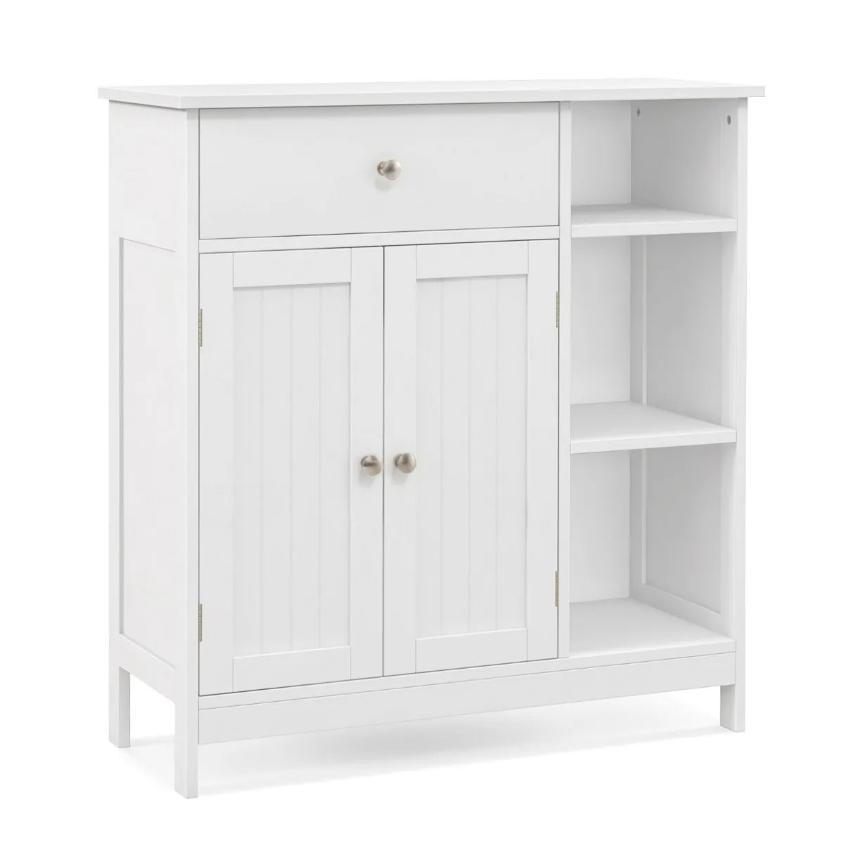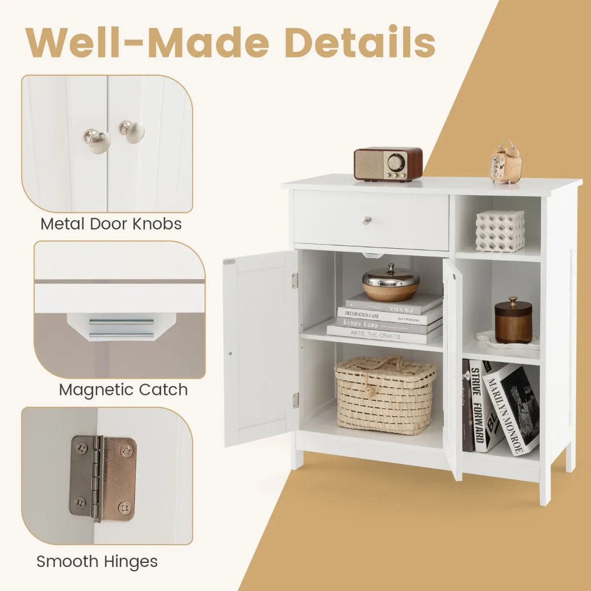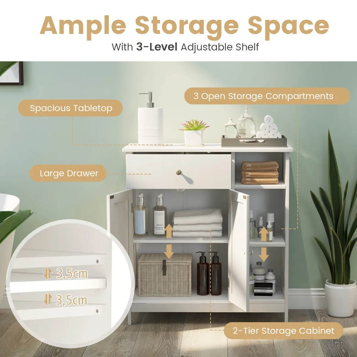Deze vrijstaande badkamerkast combineert open en verborgen opbergruimte om aan je verschillende opbergbehoeften te voldoen, waaronder een grote lade, een kast en 3 open opbergvakken. Bovendien is het rek aan de binnenkant van de kast drievoudig in hoogte verstelbaar, zodat het geschikt is voor voorwerpen met verschillende hoogtes. Om veiligheidsredenen is deze kast uitgerust met een metalen ladegeleider en een kantelbeveiliging om kinderen tegen onnodige ongelukken te beschermen.