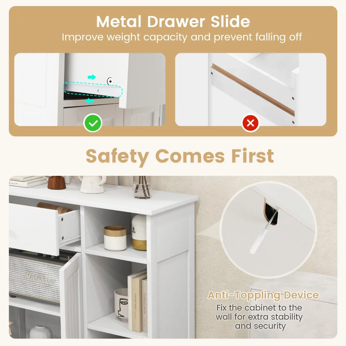 Veiligheid staat op de eerste plaats: De metalen lade verbetert het draagvermogen en voorkomt dat de lade eraf valt als de kast omvalt. Bovendien kun je de kast voor extra stabiliteit en veiligheid met de meegeleverde kantelbeveiliging aan de muur bevestigen.