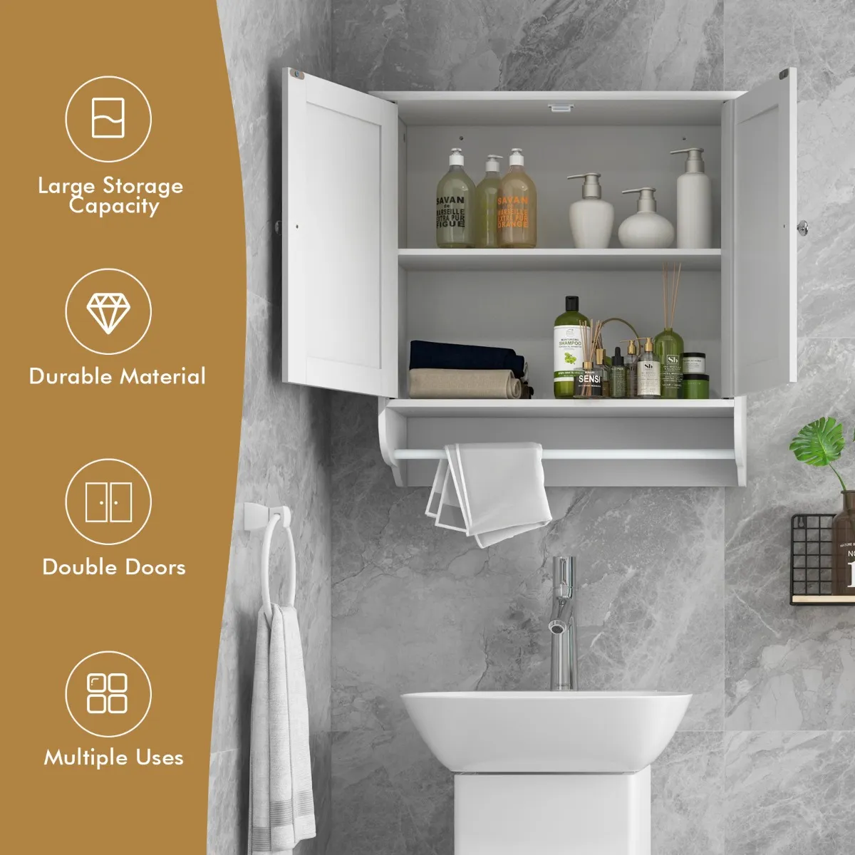 Deze 2-laags wandkast heeft genoeg ruimte om je dagelijkse benodigdheden in op te bergen. De handdoekhouder onderaan biedt een plek om je natte handdoeken op te bergen en ze droog te houden. Het heeft een verstelbare plank met 3 standen voor het opbergen van spullen van verschillende afmetingen. Deze multifunctionele, ruimtebesparende kast is perfect voor kleine ruimtes en kan worden gebruikt in je badkamer, keuken, woonkamer of bijkeuken. Hij is gemaakt van hoogwaardig MDF, is duurzaam en heeft een stijlvolle uitstraling en praktisch ontwerp.