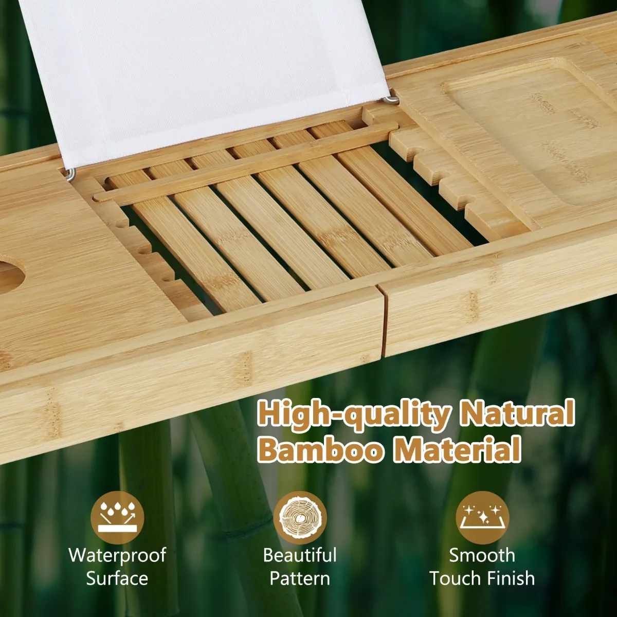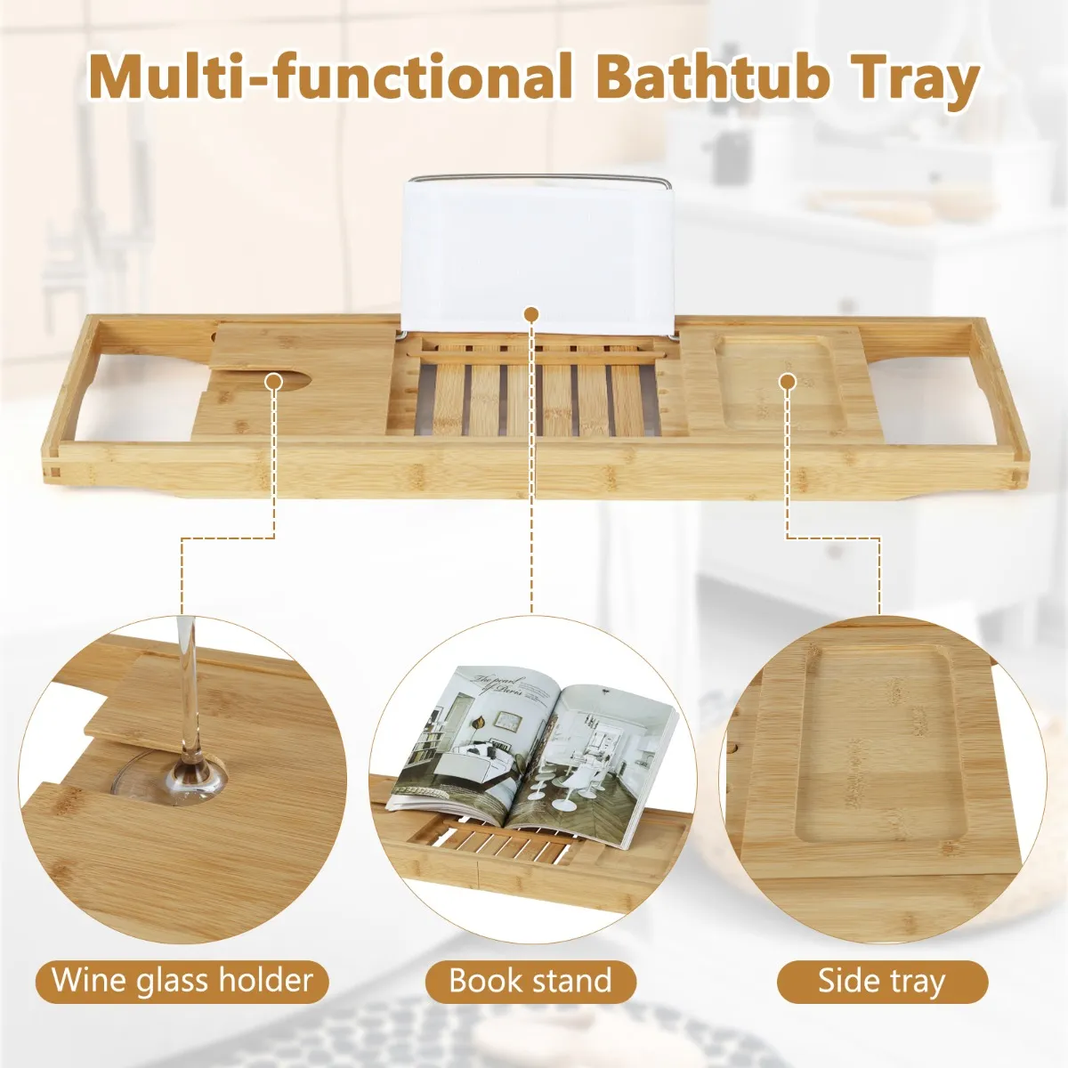 Multifunctionele badschaal : De praktische badschaal houdt al je badbenodigdheden binnen handbereik zodat je kunt genieten van een heerlijke tijd. Met een glashouder voor je wijn, een houder voor je boek en tablet, en een diepe zijplank om aromatherapie, zeep, essentiële oliën en andere toiletartikelen op te bergen.