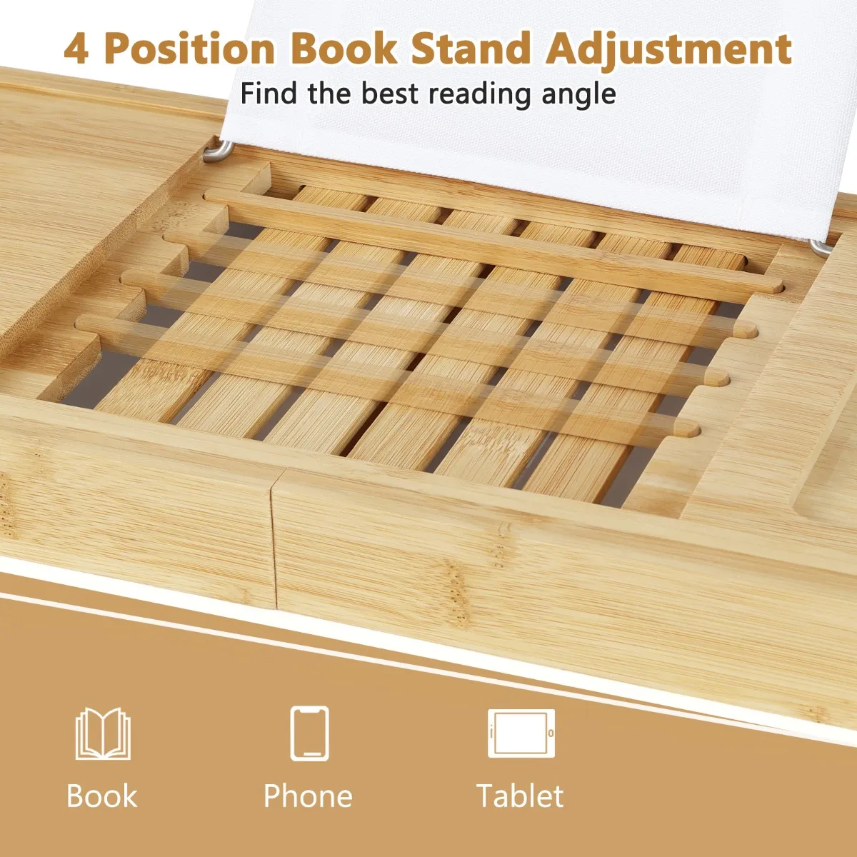 Gebruiksvriendelijke boekenhouder : Ons bad dienblad heeft een 4-positie boekenhouder verstelling, zodat je de beste hoek kunt vinden om te lezen, telefoon of tablet in verschillende posities. Bovendien beschermt de stoffen rand je boek tegen druppels en spatten, waardoor het de ideale keuze is om te lezen en te ontspannen in de badkamer.
